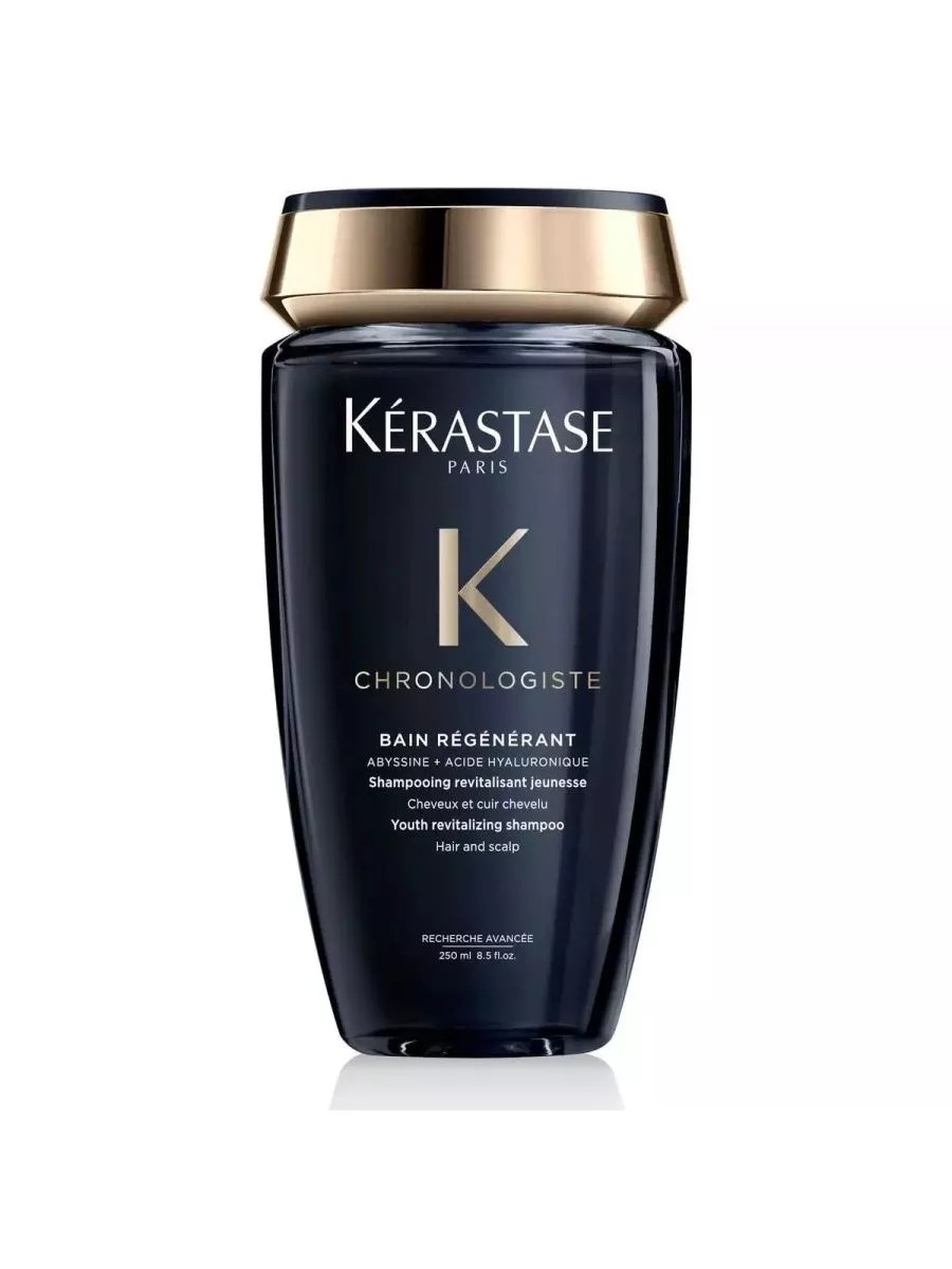 Kerastase Chronologiste Regenerant is a revitalizing and toning shampoo-bath that combats the main signs of aging of the scalp and hair: dry, sensitive, weakened scalp and dull, brittle and thinning hair. Contains hyaluronic acid, the Abyssin molecule and Vitamin E, which combat the main signs of aging. Provides long-lasting hydration to the scalp, strengthens hair, saturates it with moisture, restores elasticity and adds luxurious shine. The product has a recognizable subtle Chronologiste aroma with notes of tea rose, light wood and musk. Provides a feeling of comfort. Hair and scalp are 44% more hydrated 48 hours after use. Intensively cleanses hair and removes impurities. Makes hair stronger. Restores hair's natural shine. 250 ml