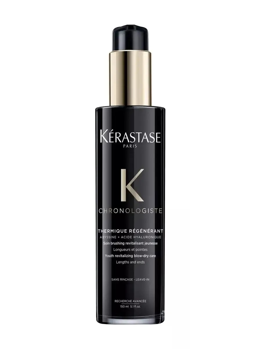 Kerastase Chronologiste Thermique Regenerant is a revitalizing styling treatment that smooths the surface and restores hair texture. Contains Hyaluronic Acid, Abyssin Molecule, and Vitamin E, which combat the main signs of aging. Regenerant Thermal Care protects against high temperatures (up to 230°C) and humidity for 24 hours. It facilitates styling, restores elasticity, and adds luxurious shine. It has the recognizable, subtle Chronologiste scent with notes of tea rose, light wood, and musk. Thermal protection. 150 ml
