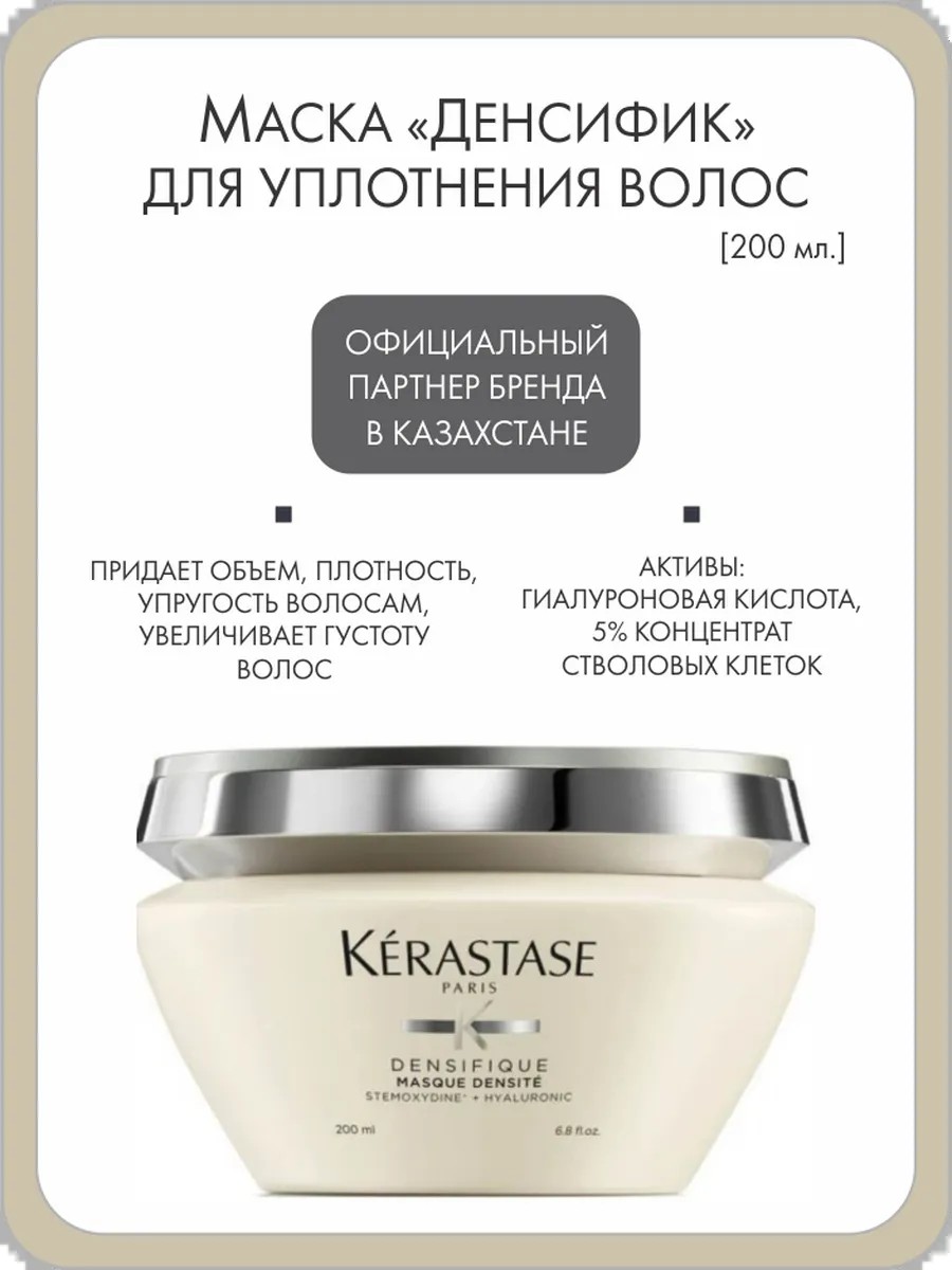 An innovative restorative mask for thinning, fine hair. It restores and strengthens the hair structure, making it noticeably thicker and more well-groomed. The exquisite texture provides an instant transformation from the moment the product is applied. It adds lightness and smoothes frizz to hair that lacks volume. It restores hair along its entire length. Contains innovative technology: Stemoxydine (Stemydine), the key molecule in the Densifique line, at a maximum 5% concentration, optimizes hair growth cycles and significantly increases the number of hairs per square centimeter. It activates dormant hair follicles and increases density; Hyaluronic C is a combination of two molecules with complementary properties. The first component, hyaluronic acid, is an ultra-moisturizing molecule that can retain 1,000 times its weight in moisture. It is one of the most important sources of hydration, naturally present in the skin. Another component, ceramide, is a patented active ingredient that restores and protects hair by strengthening the cuticle. Glucopeptides act from root to tip, filling in tissues that lack density. They supply lipids and restore the fiber, making hair uniformly thick. Hair becomes more flexible, strong, and full-bodied.