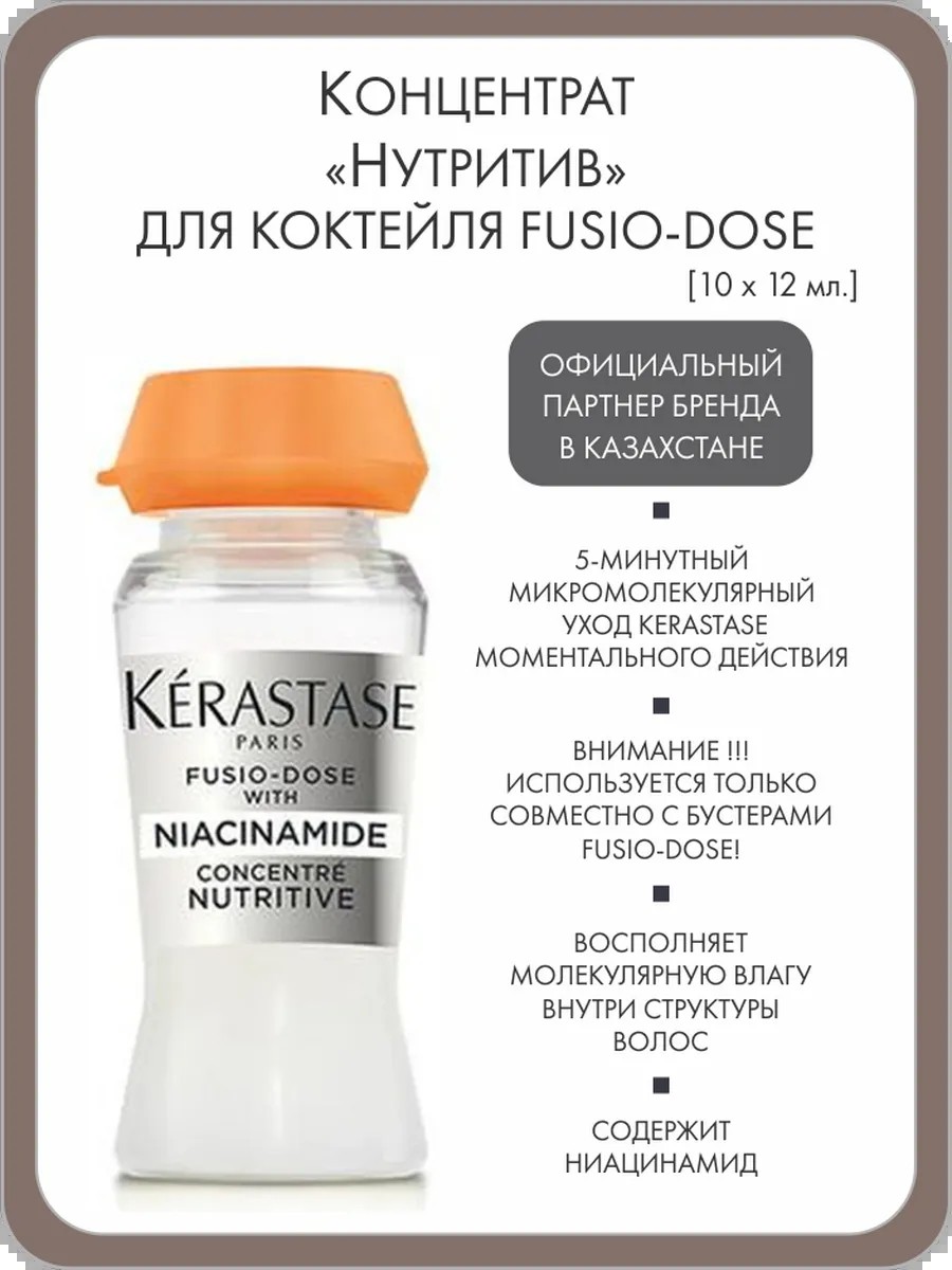 Концентрат-питание для глубоко увлажняющего и восстанавливающего ухода. Интенсивно увлажняет волосы ниацинамидом для обеспечения более здоровых волос. Результат: волосы на 66% мягче. Активные компоненты: Ниацинамид + Глицерин + Масло авокадо + Масло семян жожоба. Применение: Использовать средство исключительно с бустером Fusio-Dose. Наденьте бустер на открытый флакон концентрата Fusio-Dose, прокрутите по часовой стрелке, а затем – против, так, чтобы доза из бустера попала во флакон. Встряхните флакон, чтобы его содержимое стало однородно. Смените бустер дозатором от флакона и распылите жидкость по всей длине предварительно вымытых шампунем влажных волос, прядь за прядью, на расстоянии 10 см. Времени выдержки не требуется. Смыть обильным количеством воды.