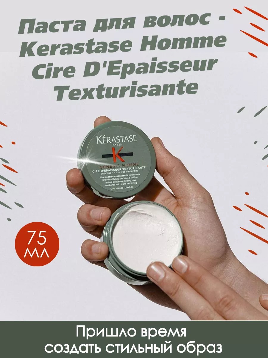Паста для волос - Kerastase Homme Cire D'Epaisseur Texturisante, 75 мл - это мгновенно загустевающая моделирующая глина для ослабленных волос, склонных к истончению. Пришло время создать стильный образ с помощью профессионального средства для укладки волос. Креатин - Восстанавливает и усиливает волокна волос изнутри и улучшает механические качества кожи головы, защищая от УФ-излучений и жарой обусловленных повреждений, создавая моментальный и более усовершенствованный вид. Корень имбиря - Знаменит своим свойством защищать от ежедневных внешних агрессоров, которые могут повредить вашу границу волос. Гель паста увеличивает обмен клеток волос и стимулирует кожу головы, предлагая лучший уход за волосами. Мужская паста GENESIS также подходит для стайлинга бороды, усов и бровей. Его уникальная формула с уплотняющим воском обеспечивает густоту и текстуру, придавая вашему образу завершенность. Способ применения: Используйте фиксатор в сочетании с шампунем Kérastase Bain de Masse для максимального утолщения и придания объема. Для укладки волос достаточно взять немного глины и нанести на мокрые или сухие волосы, затем уложить желаемыми движениями. Начните с небольшого количества крем пасты и наращивайте по мере необходимости для получения желаемой текстуры и стойкости. Используйте расческу или пальцы для создания текстуры и четкости. Чтобы активировать фиксацию в течение всего дня, просто проведите по волосам пальцами. Красота с косметикой для волос Керастаз спасет мир!