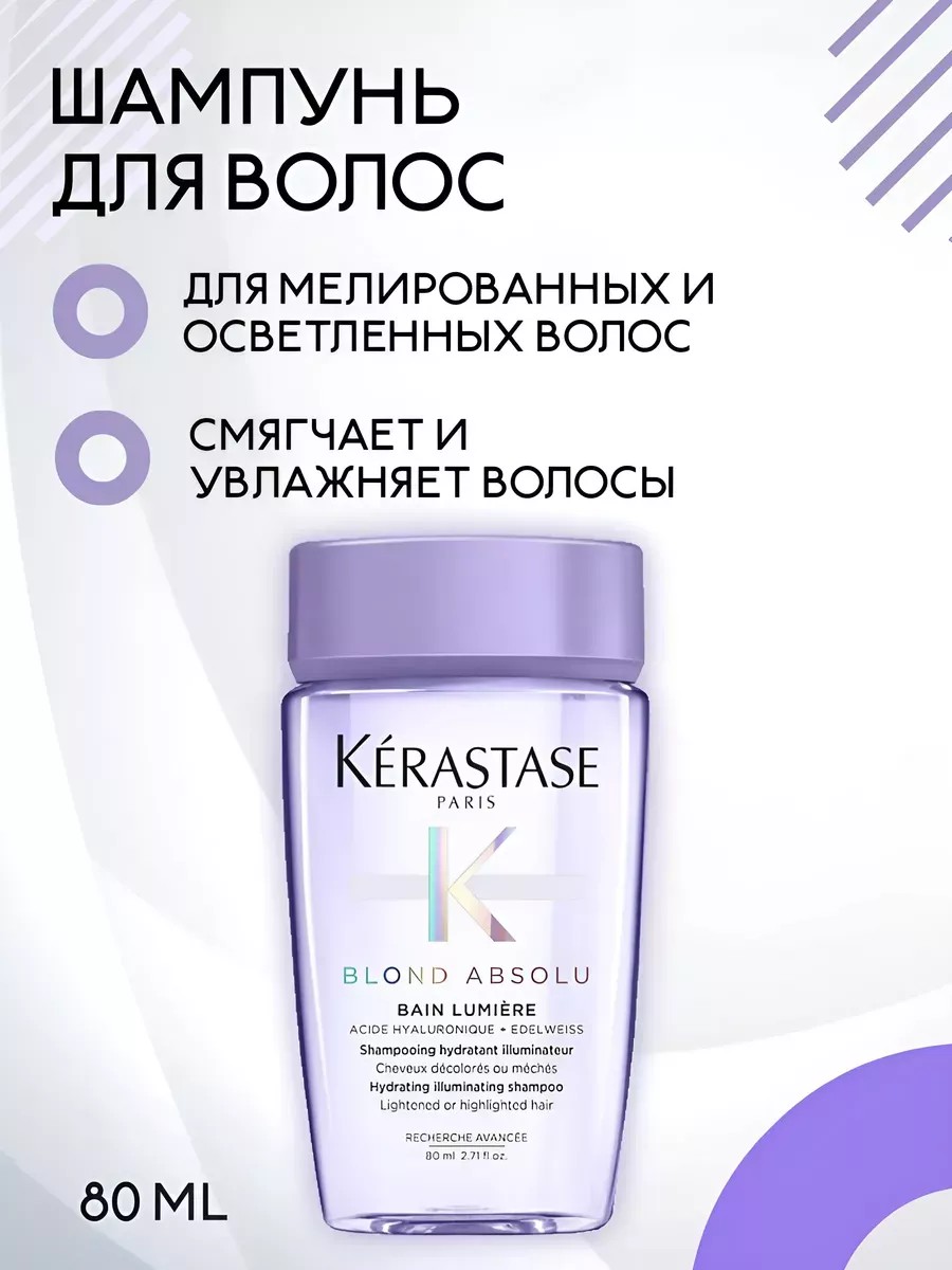 Шампунь - ванна увлажняющий для светлых окрашенных волос Люмьер БЛОНД АБСОЛЮ. Формула шампуня с гиалуроновой кислотой KERASTASE BLOND ABSOLU Bain Lumiere подходит для мелированных и осветленных волос. Обеспечивает интенсивное очищение, смягчает и увлажняет волосы от корней до самых кончиков.- Гиалуроновая кислота известна своими увлажняющими свойствами.- В экстракте цветка эдельвейса содержится большое количество антиоксидантов, которые помогают защитить волосы от негативных воздействий окружающей среды. Шампунь очищает волосы от загрязнений и эффективно удаляет микрочастицы пыли, которые делают волосы тусклыми и безжизненными. В сочетании с уходом Цикафлаш делает волосы более устойчивыми к ломкости. Питает волосы до 24 часов. Мгновенно придает волосам блеск, который держится до 24 часов. Поможет избавиться от желтизны и нейтрализовать нежелательные оттенки, восстанавливая и придавая благородный оттенок. В составе содержатся специальные средства - кератин, протеины и масла, которые помогают сохранить холодный оттенок и предотвратить желтизну. Профессиональные оттеночные осветляющие шампуни для осветленных волос рекомендуются для использования в салонах красоты и домашнем уходе. Шампунь идеально подходит для всех типов волос, включая обесцвеченные и окрашенные. Линейка косметики Blond Absolu обеспечивает глубокий уход за осветленными волосами от ультрафиолета, защищает их от окисления, мгновенно нейтрализует медный оттенок и придает блеск светлым волосам. Способ применения: намочите и слегка отожмите волосы, затем на 5 основных зон последовательными массажными движениями нанесите небольшое количество шампуня. Добавьте немного воды и помассируйте. Тщательно промойте волосы водой. Красота с косметикой для волос Керастаз спасет мир!