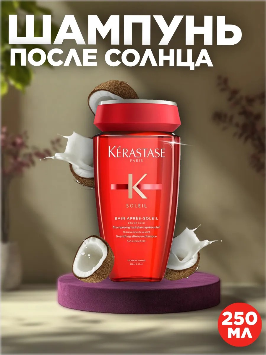 Шампунь после солнца с кокосом - Kerastase Soleil Bain Apres, 250 мл. Шампунь-Ванна после солнца Soleil Bain Apres-Soleil с прозрачной гелевой текстурой бережно смывает соль, хлор и песок, оставшиеся на волосах, не высушивая их. Деликатно очищает локоны от загрязнений, имеет мягкую деликатную формулу, которая подходит для частого применения. Кокосовая вода в составе шампуня увлажняет волосы по всей длине и восстанавливает гладкость. УФ-фильтр защищает структуру волоса от воздействия солнца. Уникальное сочетание кокосовой воды, витамина Е и УФ-фильтра. Кокосовая вода глубоко проникает в структуру волоса, обеспечивая максимальное увлажнение. Витамин Е помогает удерживать влагу, уменьшает ломкость и защищает волосы от внешних повреждений. УФ-фильтр поглощает УФ-лучи и уменьшает их негативное воздействие на структуру волос.