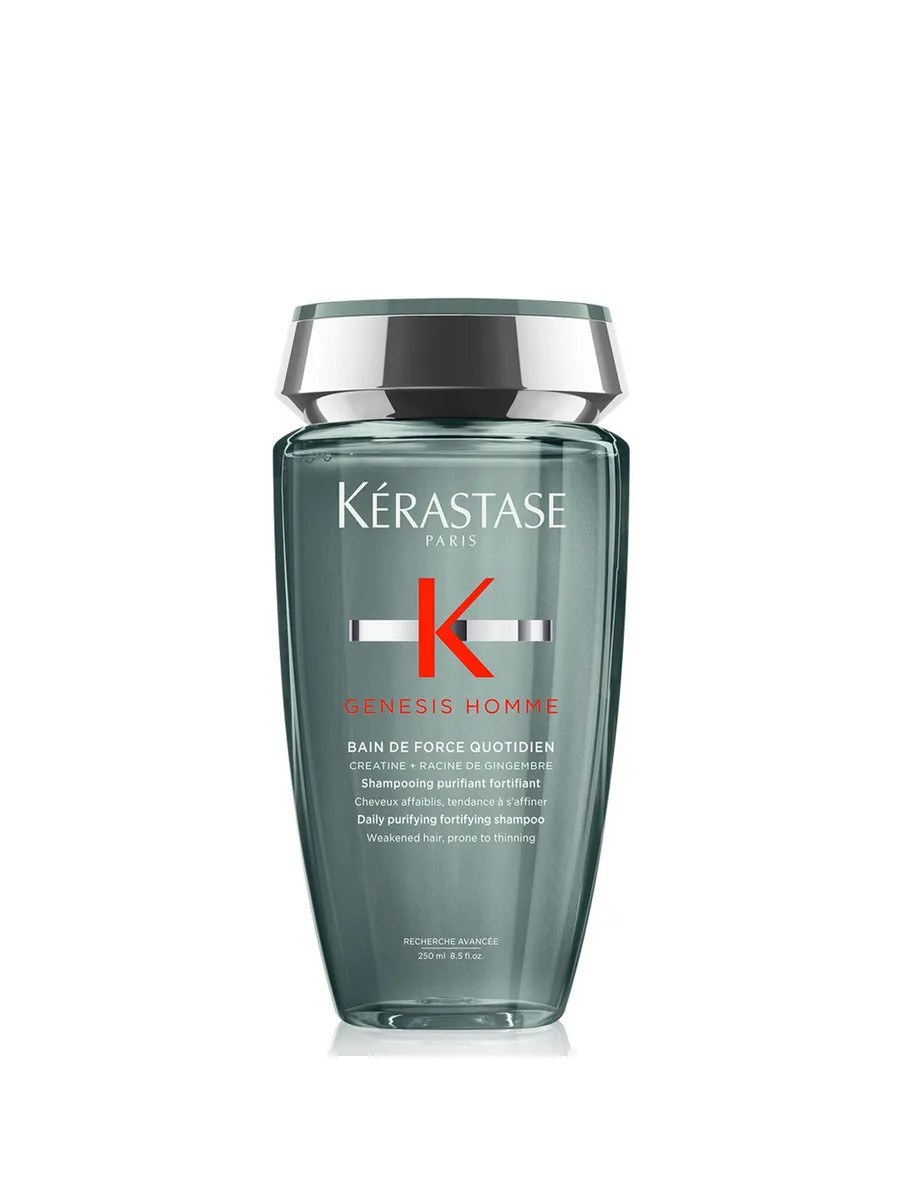 Genesis Homme Bain de force Quotidien by Kérastase is a daily cleansing and strengthening shampoo for men with weakened hair prone to thinning.