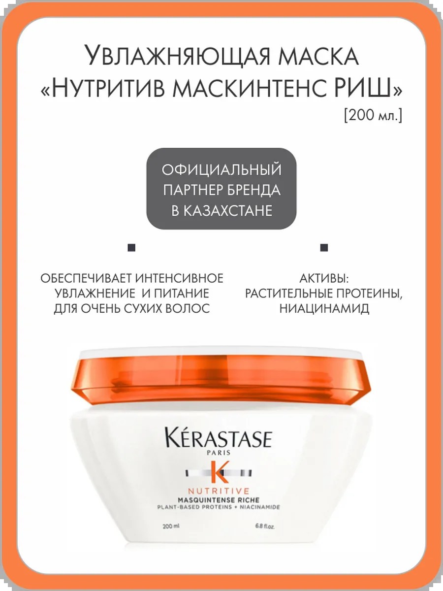 A deeply nourishing, ultra-concentrated mask, "Nutritive Masquentens Rich," for very dry, medium, and thick hair. Contains anti-dryness polymers that maintain hair's lightness and flexibility, as well as essential nutrients that enhance the formula's ability to nourish and strengthen hair. Plant proteins from wheat, corn, and soy, blended with fatty acids, omegas, and vitamins, provide intense nourishment. Niacinamide, a vitamin B3 derivative, strengthens the hair fiber, while nourishing lipids combined with glycerin are optimally balanced to provide essential nourishment. It has a rich, thick, snow-white creamy texture. Provides up to 89% instant hydration and nourishment for 72 hours.