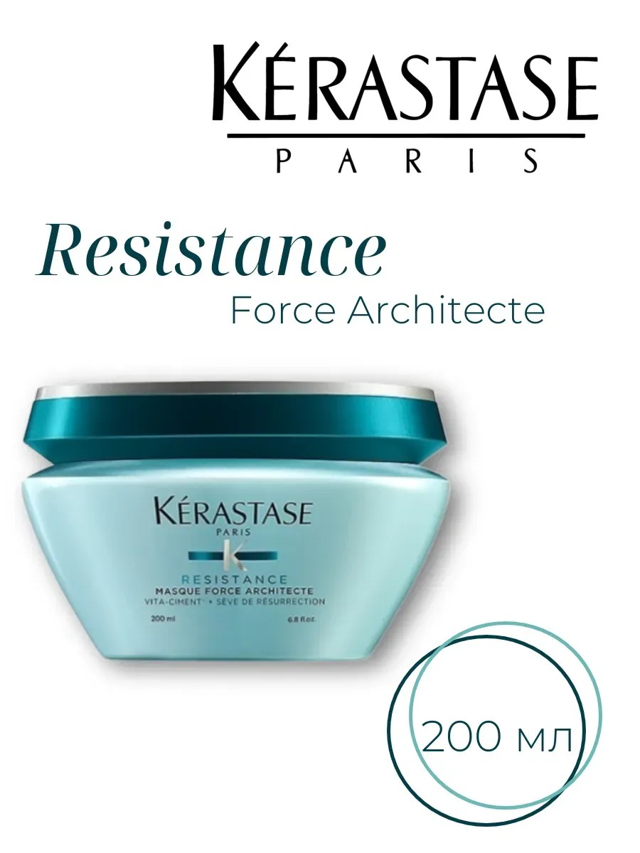 Thanks to the Intra-Cylane molecule, ceramides, and pro-keratin contained in the Kerastase mask, a three-dimensional network is created around the hair, protecting it from external influences. Hair is also given greater strength, and the hairstyle acquires shine and a healthy glow. The Kerastase Resistance Masque Force Architec mask restores intercellular connections inside the hair, fills the empty spaces between the scales, making it more resistant and strong. **Provides internal strength and a smooth texture to weakened hair and split ends, paying special attention to severely damaged areas. **Contains Complexe Ciment-Cylane 4**###### **APPLICATION****Apply the mask to damp hair and distribute along the entire length. Leave on for 5-10 minutes, and then rinse with plenty of warm water.**