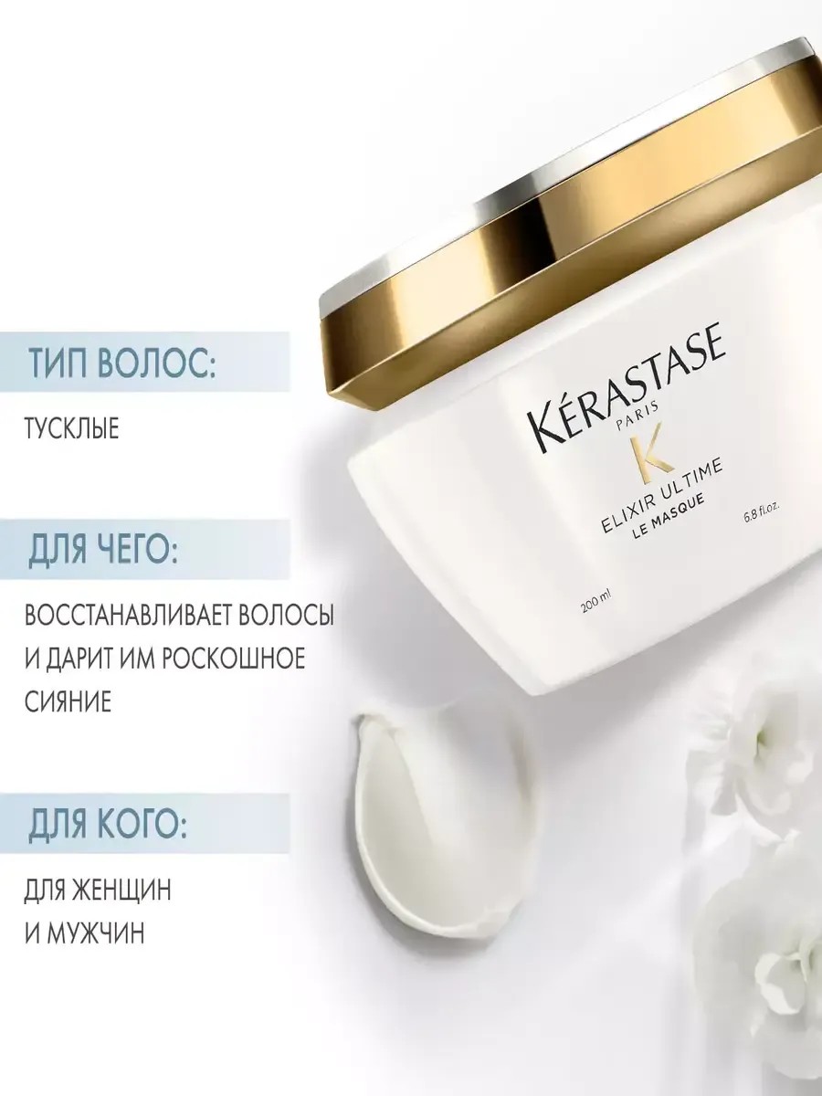 Kérastase Elixir Ultime Beauty Mask for All Hair Types, 200 ml - Ideal for dull hair of any type. This product penetrates deep into the hair shaft, filling damaged areas and preventing moisture loss. Your locks will regain their missing strength, elasticity, luxurious smoothness, and shine. This nourishing beauty mask, enriched with Elixir Ultime oils, is a professional hair care product for at-home use. Suitable for oily hair, dry hair, fine hair, and split ends. Another function of this restorative hair mask is protection from the harmful effects of styling products and heat tools. The rich nutritional complex provides intensive nourishment and reliable protection from any harmful influences. After using this multifunctional protective mask, hair is easy to comb, soft, and well-groomed. The oil complex in this mask actively moisturizes hair, making it truly vibrant. It has a natural composition. Curls are completely tangle-free, easy to comb, and shiny. This product restores moisture balance without weighing hair down, filling in thinning and damaged areas on each strand, healing them and preventing split ends. It doesn't weigh hair down, leaving no greasy or oily feeling. The pleasant scent lasts for 48 hours. Treat yourself to professional hair care at home.