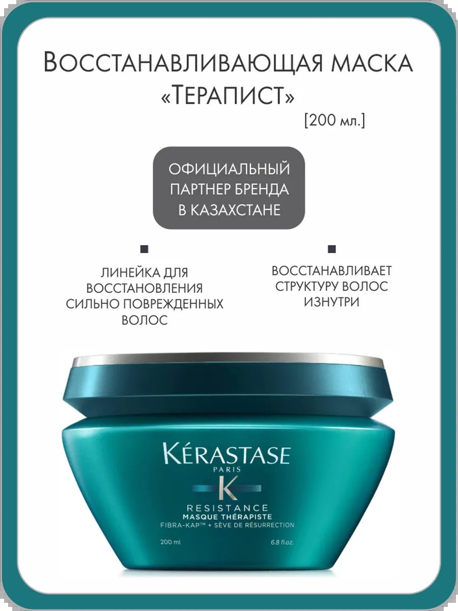 Интенсивная восстанавливающая маска "Терапист" для сильно поврежденных волос. Похожая на масло текстура, воздействует до самых глубоких слоев волокон, восстанавливая не только поверхность, но и структуру волос. Уникальный комплекс FIBRA-KAP / ФИБРА-КЭП компенсирует недостаток белков, сопутствующих кератину в структуре волоса, и стимулирует их синтез. Гликозид сафлора снабжает фолликулы энергией, необходимой для активации синтеза белков, сопутствующих кератину. Входящие в состав 6 аминокислот, гидролизованный протеин пшеницы и растительный сок миротамнуса, известный также как «оживающее растение» восстанавливает поврежденные участки волоса. Тонизирует и возвращает жизненные силы волосам подвергающихся механическим, химическим и термическим воздействиям. Волосы вновь обретают силу и эластичность.
