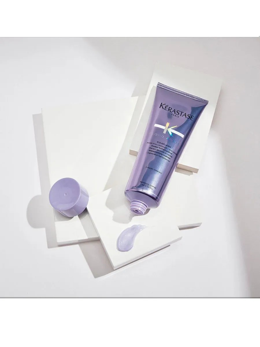 Kerastase Blond Absolu Cicaflash Treatment, a milk-based treatment for bleached hair, is used for deep nourishment, restoration, and protection of damaged hair.
