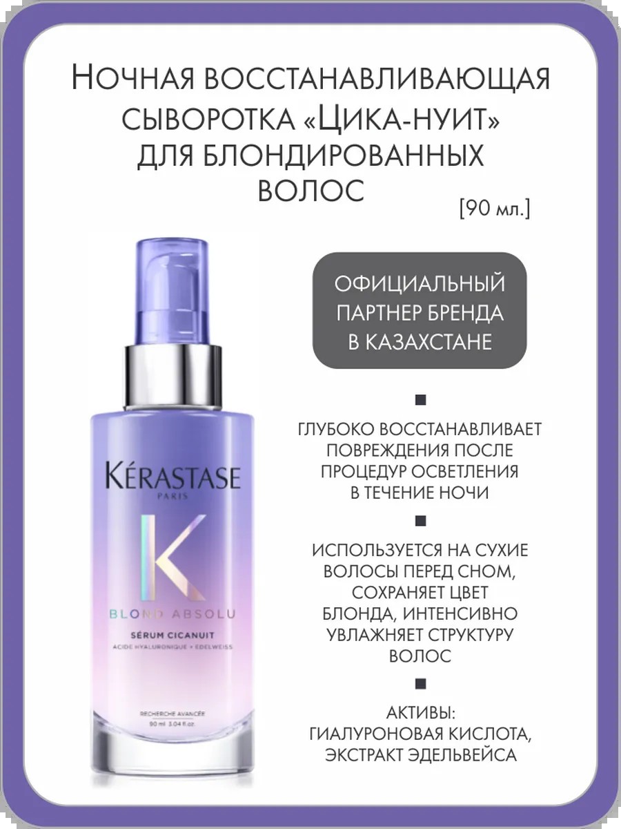A night serum for deep repair of post-bleach damage. Strengthens and moisturizes sensitive hair after bleaching, increasing its softness and shine. This serum, rich in hyaluronic acid, hydrates and intensively repairs hair while you sleep, leaving it looking flawless in the morning. Hair is left moisturized, soft, and smooth. Ideal for highlighted or bleached hair. Directions: Use Cicanuit serum on dry hair before bed. Dispense a small amount of serum between your hands and apply to the lengths and ends. No rinsing required in the morning.