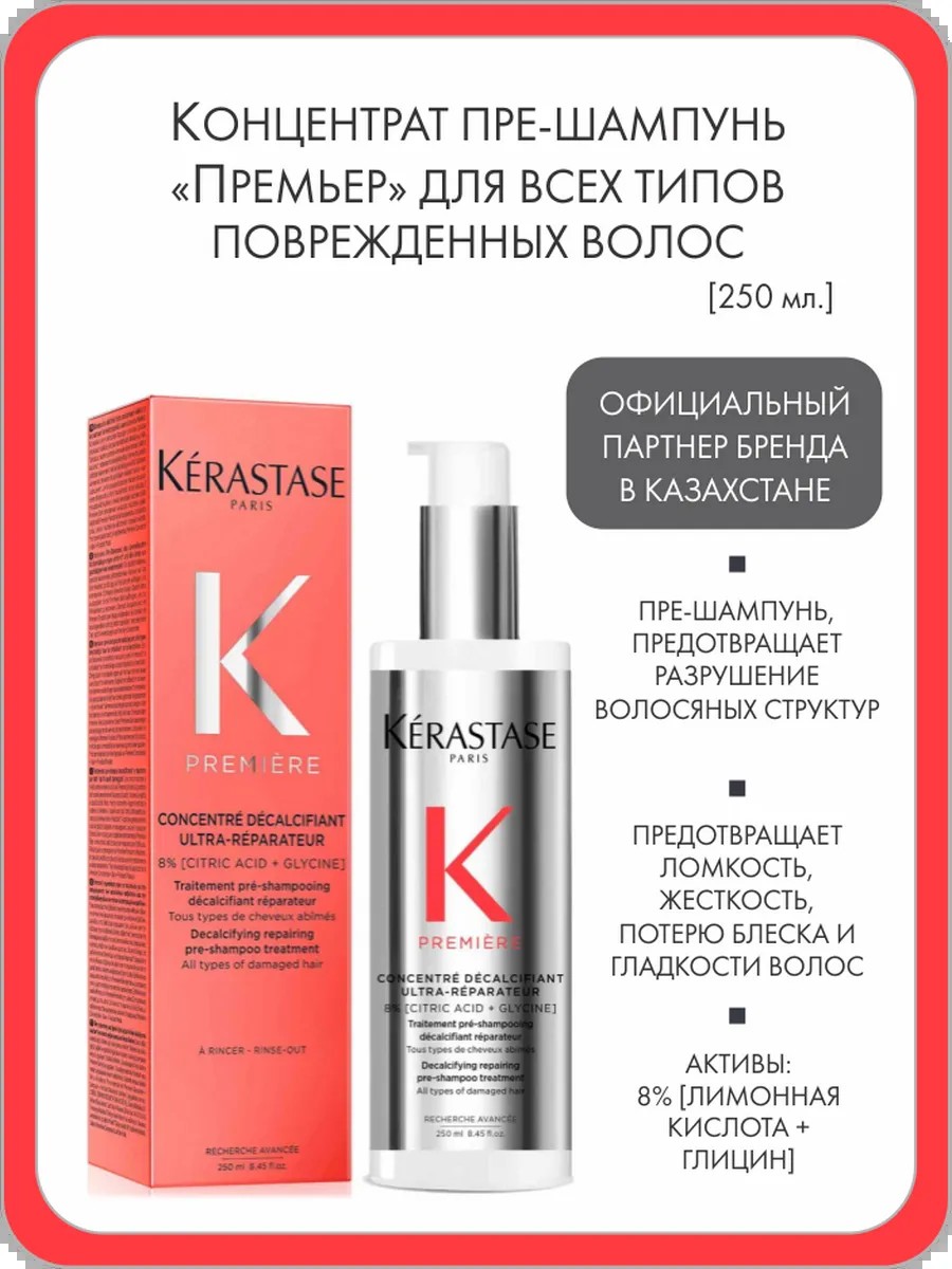 Применение: Смочите немного волосы водой. Обильно нанесите средство перед шампунем на волосы, уделяя особое внимание длине и кончикам, обеспечивая равномерное покрытие по всей длине. Кончиками пальцев массируйте кожу головы и волосы, чтобы равномерно распределить продукт. Оставьте на 5 минут и не смывайте, чтобы максимизировать эффективность. Нанесите восстанавливающий шампунь из линейки Kérastase Première непосредственно поверх пре-шампуня. Тщательно смойте и нанесите восстанавливающий кондиционер или маску из линейки Kérastase Première.