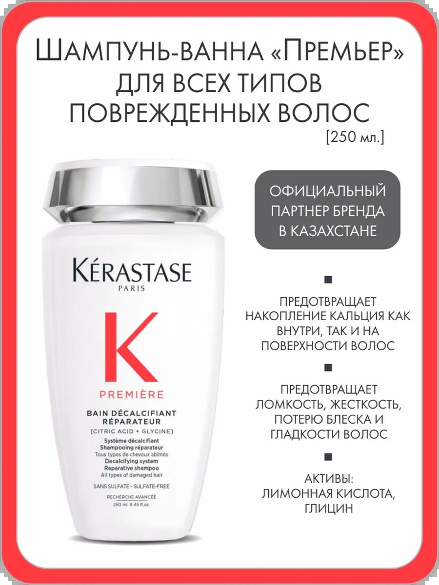Шампунь-ванна для декальцинации и восстановления всех типов поврежденных волос. Восстанавливает структуру волос изнутри, уменьшает ломкость и восстанавливает их силу. Обеспечивает эффект более гладких, послушных, блестящих и эластичных волос. При каждом контакте с водой кальций накапливается и проникает между кератиновыми структурами и разрушает их связи, делая волосы более жесткими и ломкими изнутри. Снаружи кальций накапливается на поверхности волос, что приводит к потере блеска и отсутствию гладкости. Кроме того, поврежденные волосы из-за пористости могут поглощать до 3 раз больше кальция из проточной воды (чем неповрежденные волосы), провоцируя перенасыщение кальцием. Для декальцинации лимонная кислота работает на поверхности, а также проникает внутрь волос, способствует ликвидации перенакопления кальция – для противодействия потере блеска и гладкости волос. После устранения перенакопления кальция, глицин проникает в волосы для восстановления разрушенных кератиновых связей и уменьшает ломкость волос. В качестве укрепляющего ингредиента пептиды способствуют заполнению и закрытию кутикулы волос – для укрепления поверхности, увлажнения и блеска.