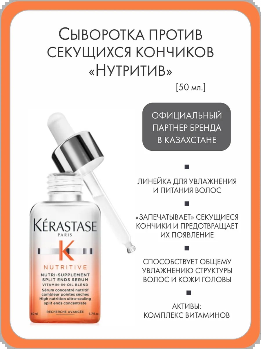 A highly nourishing, ultra-sealing serum for dry hair with split ends. Contains anti-dryness polymers that seal dry ends and prevent their recurrence. It also provides a dose of essential nutrients that enhance the formula's ability to nourish and strengthen hair. A blend of vitamins in the oil enhances the formula's nourishing and strengthening properties. Film-forming polymers further promote overall scalp hydration, protecting it from dehydration.