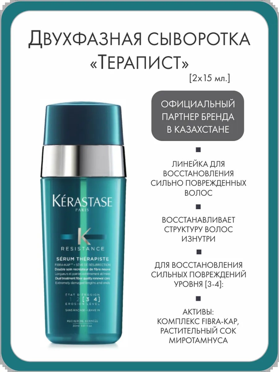 Двухфазная интенсивно восстанавливающая сыворотка "Терапист" для сильно поврежденных волос. Масляная и кремовая текстура мгновенно восстанавливает и укрепляет волосы по всей длине, запечатывая секущиеся кончики. Защищает волосы от негативного влияния высоких температур (до 230°C).Уникальный комплекс FIBRA-KAP / ФИБРА- КЭП компенсирует недостаток белков, сопутствующих кератину в структуре волоса, и стимулирует их синтез. Гликозид сафлора снабжает фолликулы энергией, необходимой для активации синтеза белков, сопутствующих кератину. Входящие в состав 6 аминокислот, гидролизованный протеин пшеницы и растительный сок миротамнуса, известный также как «оживающее растение» восстанавливает поврежденные участки волоса.