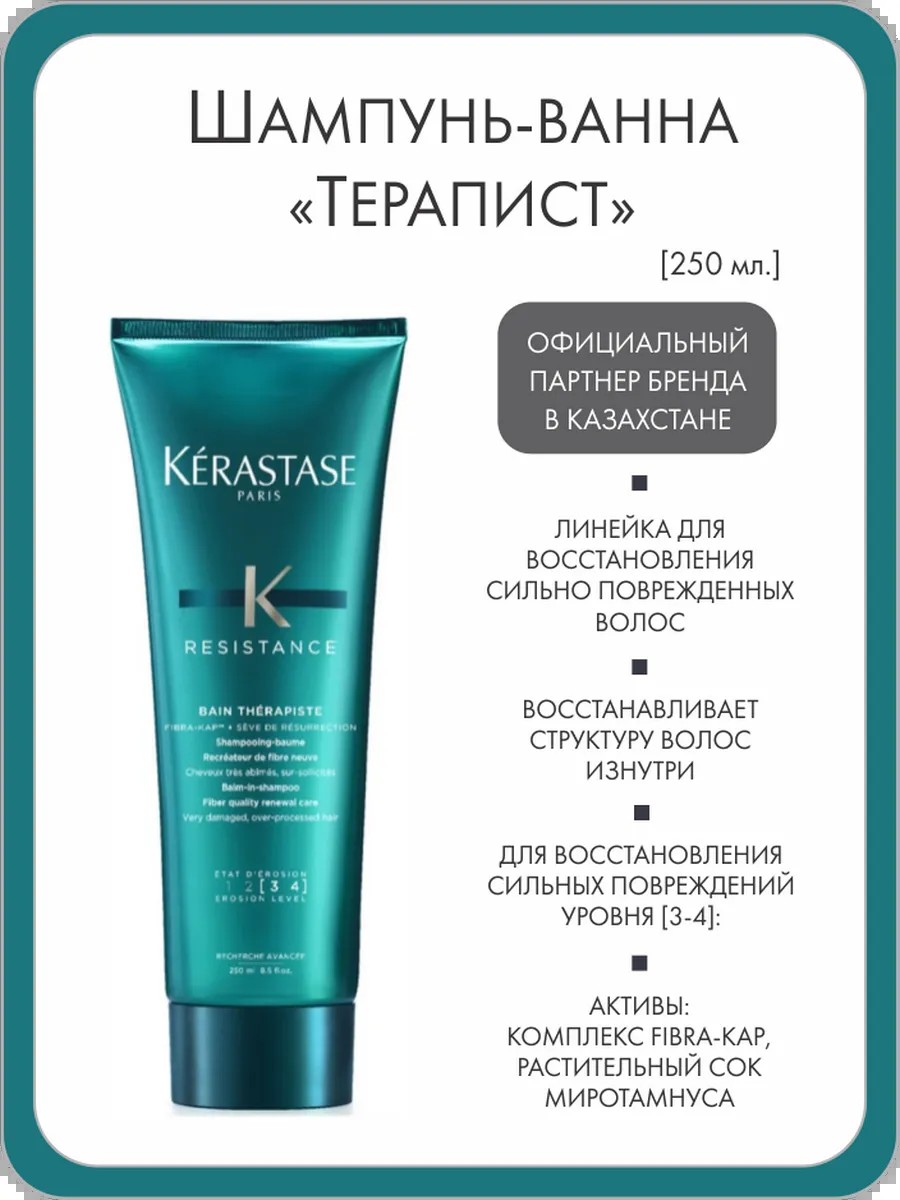 Шампунь-ванна с текстурой бальзама для восстановления сильно поврежденных волос. Разработан специально для восстановления волос регулярно подвергающихся негативным воздействиям: механическому, химическому и термическому. Обволакивает поверхность волоса для уменьшения повреждений во время мытья. Уникальный комплекс FIBRA-KAP / ФИБРА-КЭП компенсирует недостаток белков, сопутствующих кератину в структуре волоса, и стимулирует их синтез. Гликозид сафлора снабжает фолликулы энергией, необходимой для активации синтеза белков, сопутствующих кератину. Входящие в состав 6 аминокислот, гидролизованный протеин пшеницы и растительный сок миротамнуса, известный также как «оживающее растение» способствуют процессу восстановления, заполняя поврежденные участки волоса.