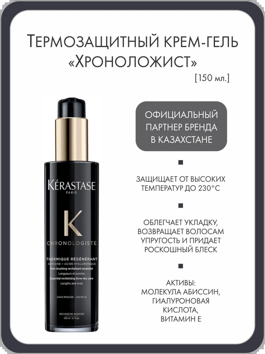 Ревитализирующий термозащитный крем "Хроноложист" для укладки, разглаживающий поверхность и восстанавливающий текстуру волос. Содержит гиалуроновую кислоту, молекулу Абиссин и витамин Е, которые борются с основными признаками старения. Термо-уход защищает от высоких температур (до 230 °С) и защищает от воздействия влажности на 24 часа. Облегчает укладку, возвращает волосам упругость и придает роскошный блеск. Обладает узнаваемым тонким ароматом Chronologiste с нотами чайный розы, древесины светлых пород и мускуса.