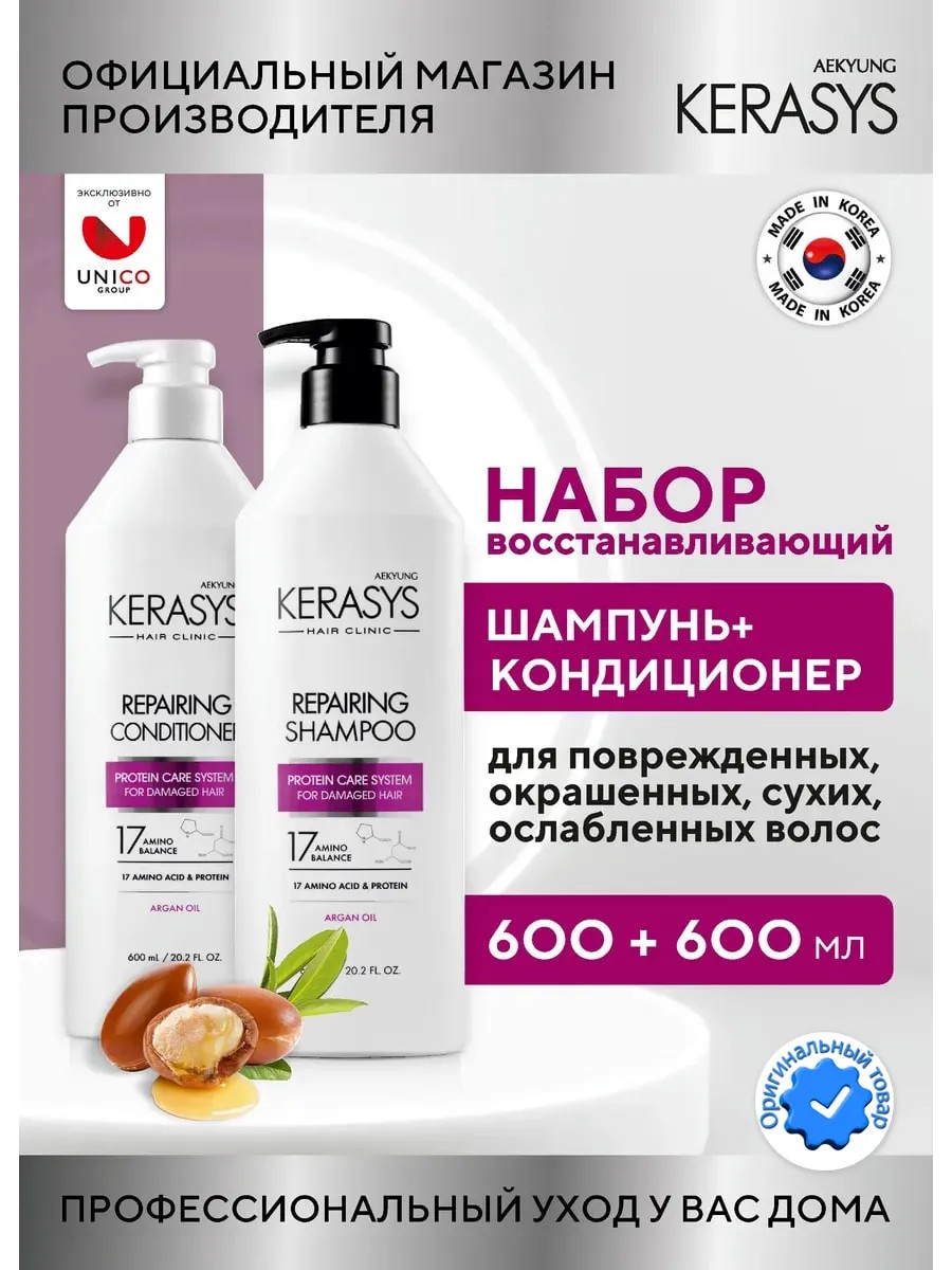 | Полное наименование товара | Kerasys Набор шампунь и кондиционер для волос Восстанавливающий CLINIC 600х2 мл, для поврежденных и сухих волос Корея |