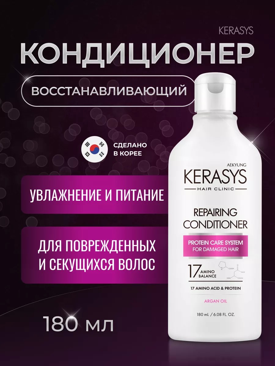 KeraSys – представляет уникальную линейку профессиональных ухаживающих средств для кожи головы и волос. Кондиционер "Восстанавливающий" разработан для сухих, ослабленных и пережжённых волос. Этот профессиональный продукт из Кореи разработан специально для женщин, которые ценят качественный уход за своими волосами. Специальная формула мгновенно восстанавливает структуру волос по всей длине, уменьшая сечение и ломкость. Волосы обретают жизненную силу, эластичность и блеск. Кондиционер обогащен лечебными веществами в составе липосом, которые проникают в клеточные структуры волоса и оказывают восстанавливающее и лечебное действие. Кератиновый комплекс заполняет поврежденные участки, трещинки и пустоты в структуре волоса, склеить посеченные кончики, укрепить волосы, придав им дополнительную прочность. Кератин подходит для восстановления волос любого типа. Аргановое масло повышает эластичность и восстанавливает нормальный уровень увлажнённости, делает волосы мягкими и шелковистыми, укрепляет структуру и снимает электризуемость. Бальзам придает ухоженный и здоровый вид волосам. Он также восполняет недостаток собственного белка в структуре волос, делая их более крепкими и здоровыми. Это особенно важно для поврежденных вследствие частого химического, теплового и солнечного воздействия волос. Кондиционер - отличный подарочный вариант для женщины или мужчины любого возраста: от подростка до взрослого человека на 8 марта, 14 февраля, 23 февраля, День рождения, Новый год и др праздники для любимой девушки или парня, мамы или папы, бабушки или дедушки, сестры или брата, подруги или друга. Очаруйте всех своими шикарными локонами, благодаря уникальному косметическому средству от корейских производителей.