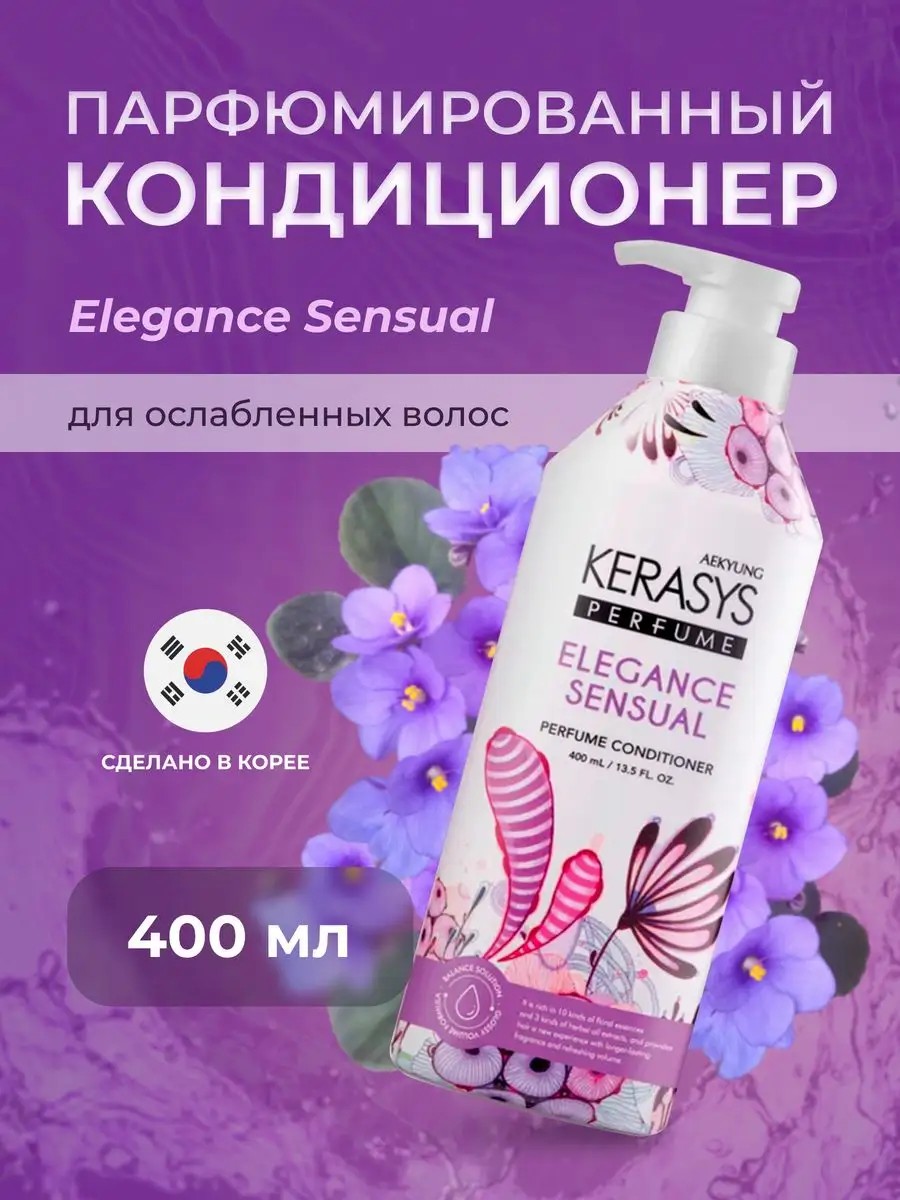 KeraSys – представляет уникальную линейку профессиональных ухаживающих средств для кожи головы и волос. Парфюмированный кондиционер для волос «Элеганс» - средство для ухода за тонкими и ослабленными волосами. Этот профессиональный продукт разработан специально для женщин, которые ценят качественный уход за своими волосами. После мытья кондиционером волосы становятся не только шелковистыми, струящимися и блестящими, но и ароматными. Все дело в парфюмированной формуле данного средства. Корейский бальзам обогащен высокоэффективными активными компонентами, которые позволяют волосам оставаться шелковистыми и мягкими. Основные действующие компоненты: Гидролизат пшеничных протеинов оказывают увлажняющее и укрепляющее действие, придают волосам блеск, повышают эластичность и плотность. Масло ши основное действие масла направлено на глубокое питание и комплексный уход за волосами и кожей головы, восстановление целостности поврежденной структуры волос. Масло оливы оказывает смягчающее и восстанавливающее действие, способствует очищению и снятию воспалений, помогает избавиться от перхоти, сухости и ломкости. Приятным запахом обладают многие кондиционеры, но в случае с «Элеганс» эффект сохраняется в течение нескольких часов. Аромат: изысканный и грациозный аромат с нотками лилового цвета для современной и утонченной натуры. Подчеркнет Ваш стиль и элегантность. Эксклюзивные ароматы Kerasys подчеркнут Вашу индивидуальность. Для комплексного ухода используйте шампунь вместе с кондиционером Kerasys. Кондиционер - отличный подарочный вариант для женщины любого возраста: от подростка до взрослого человека на 8 марта, 14 февраля, День рождения, Новый год и др праздники для любимой девушки, мамы, бабушки, сестры, подруги. Очаруйте всех своими шикарными локонами, благодаря уникальному косметическому средству от корейских производителей. Не откладывайте заботу о красоте ваших волос на потом - попробуйте наш кондиционер уже сегодня и почувствуйте разницу с первого применения!