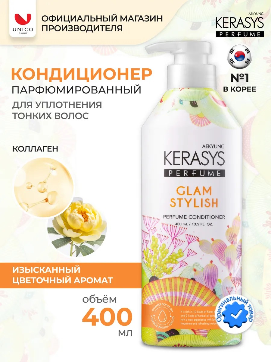 Уникальный и утонченный парфюмированный уход ГЛАМУР для ВСЕХ ТИПОВ ВОЛОС - вот что предлагает вам Kerasys Perfumed Line. Этот ароматный уход за волосами был создан благодаря исследовательскому институту парфюмированных ингредиентов Aekyung ind, который провел сравнительный анализ самых популярных и горячо любимых ароматов элитной парфюмерии. Результатом стало появление Kerasys Perfumed Line - уникального искусства составления букета ароматов, которое долгое время воспринималось потребителями как исключительное. Основой ухода являются экстракт цветов ромашки и аргановое масло. Они придают волосам дополнительный блеск и эластичность, сохраняют гладкую текстуру по всей длине и подходят для всех типов волос. Уникальность этого ухода заключается в идеальном соотношении 10 видов цветочных экстрактов и 3 вида растительных масел, которые обеспечивают идеальное увлажнение волос. Kerasys Perfumed Line также предлагает 2 в 1: бережный уход за кожей головы и волосами, а благодаря наличию коллагена, внешний вид волос улучшается, они становятся упругими и эластичными. Коллаген фиксирует влагу, борется с сухостью и уплотняет структуру волосяного стержня. Кроме того, коллаген окутывает локоны тонкой защитной пленкой, склеивает чешуйки кутикулы, что придает гладкость и шелковистость волосам. В результате волосы меньше пушатся и путаются, а статика волос убирается. Но всё-таки ГЛАВНАЯ СУПЕРСПОСОБНОСТЬ Kerasys Perfumed Line - стойкая парфюмерная капсула, созданная по уникальной технологии Kerasys. Это значит, что вашим волосам будет сопутствовать стойкий аромат, который подчеркнет вашу индивидуальность. Аромат Kerasys Perfumed ГЛАМУР придется по душе яркой, стильной, смелой и чувственной девушке. Он начинается с нот чина душистой и османтуса, создавая неповторимую парфюмерную композицию.