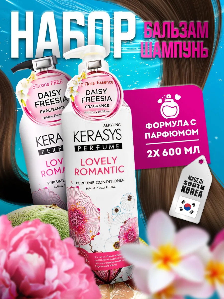 Представляем вам Kerasys - парфюмированный набор для волос Lovely Romantic, который содержит шампунь и бальзам в объеме 600 мл (х2) с дозатором. Данный набор содержит специально разработанную формулу для поврежденных волос с екущимися кончиками.