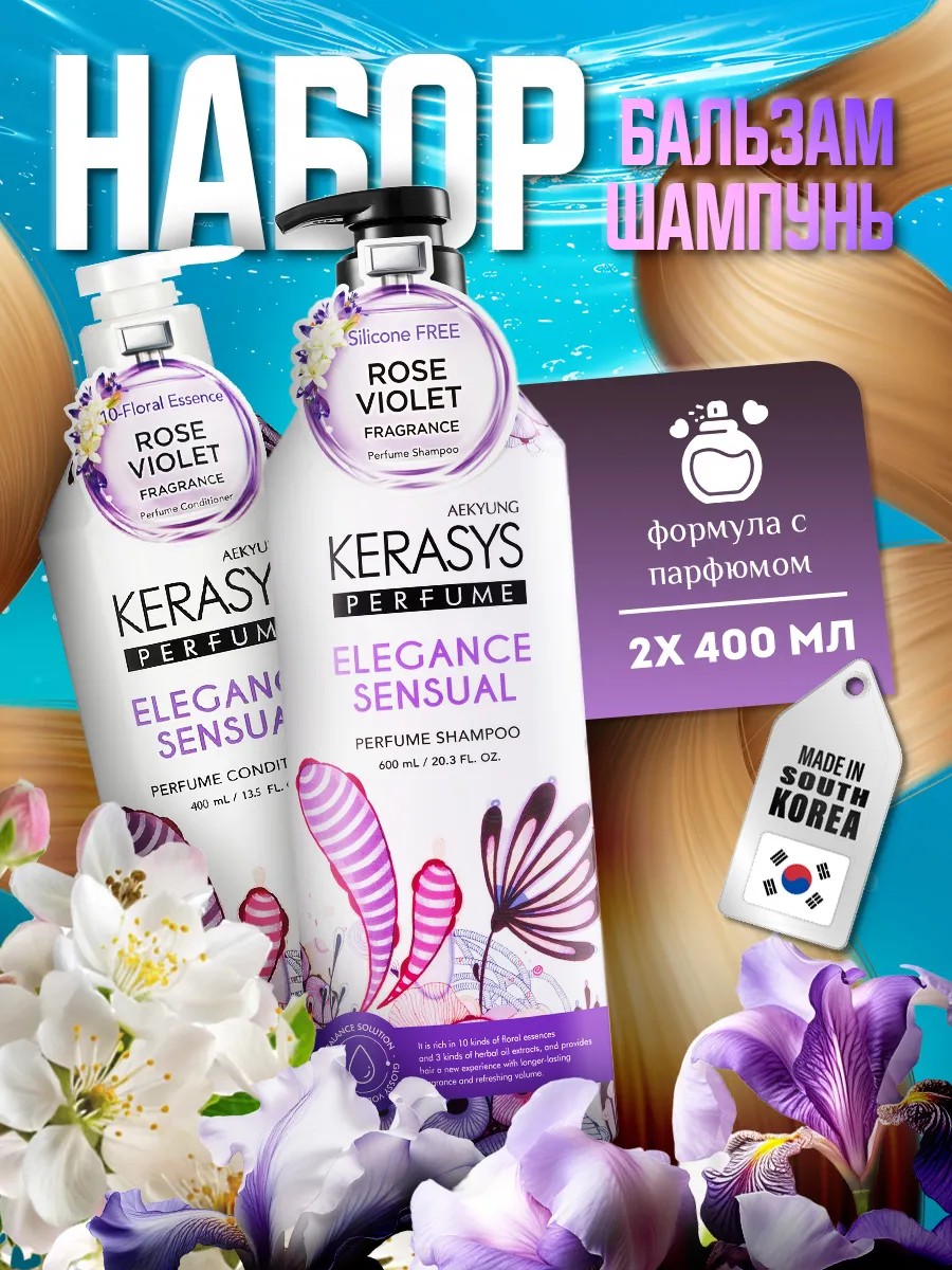 Представляем вам Kerasys - парфюмированный набор для волос Elegance&Sensual, который содержит шампунь и бальзам в объеме 400 мл (х2) с дозатором. Данный набор содержит специально разработанную формулу для ухода тонких, ослабленных и поврежденных волос. Профессиональный женский шампунь с кератином в наборе бережно очищает волосы от загрязнений, при этом не пересушивая их. Восстанавливающий бальзам кондиционер содержит масло оливы и масло ши, которые проникая в структуру волоса, придают волосам блеск и здоровый вид, создают прикорневой объем, защищают волосы от негативного воздействия внешней среды, средств для укладки и фена, облегчают расчесывание. В отличии от других шампуней, данная линейка содержит стойкий аромат парфюма (нотки фиалки), который будет сопровождать вас приятным шлейфом в течение длительного времени.