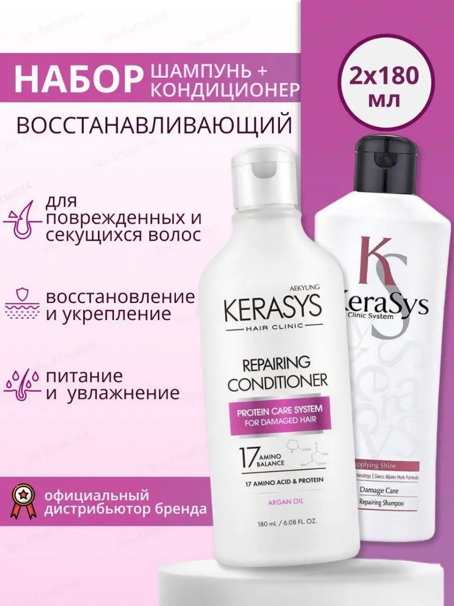 Набор шампунь и кондиционер для волос Kerasys Восстановление для профессионального ухода для ломких и поврежденных волос с секущимися концами. Шампунь для волос обогащен лечебными веществами в составе липосом, которые проникают в клеточные структуры волоса и оказывают восстанавливающее и лечебное действие. Специально разработанная формула для поврежденных волос с секущимися концами, восстанавливает структуру волос по всей длине, уменьшает сечение и ломкость. Волосы обретают жизненную силу, блеск и эластичность.Восстанавливающий кондиционер проникает в структуру волоса, оказывает лечебное действие, придавая волосам естественный блеск и здоровый вид, защищает волосы от УФ-излучения, негативного воздействия внешней среды, средств для укладки волос, фена, облегчает расчесывание. Серия для восстановления волос содержит натуральные масла арганы, жожоба и авокадо, которые укрепляют, питают и увлажняют волосы и кожу головы, стимулируя восстановление и рост волос. Корейская косметика для волос Kerasys прошла дерматологические испытания. Средства керасис подходят для секущихся, поврежденных, обесцвеченных и окрашенных волос. Набор шампунь керасис и бальзам станет прекрасным подарочным набором для Ваших близких. Набор керасис шампунь и кондиционер