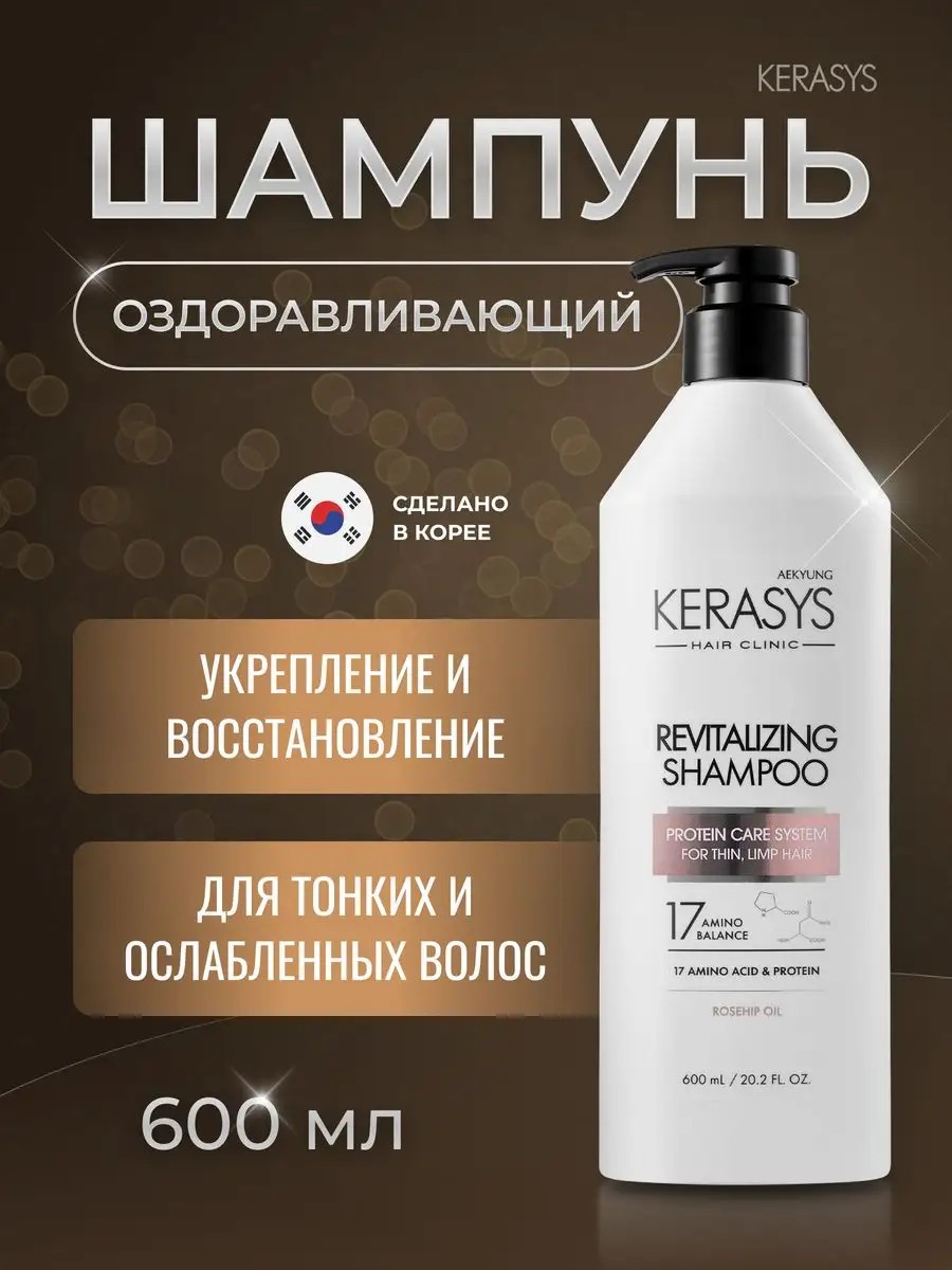 KeraSys – представляет уникальную линейку профессиональных ухаживающих средств для кожи головы и волос. Шампунь "Оздоравливающий" разработан для тонких и ослабленных волос. Этот профессиональный продукт из Кореи разработан специально для женщин, которые ценят качественный уход за своими волосами. Специальная формула мгновенно укрепляет и восстанавливает структуру волос по всей длине. Волосы обретают жизненную силу, эластичность и объем. Шампунь обогащен лечебными веществами в составе липосом, которые проникают в клеточные структуры волоса и оказывают восстанавливающее и лечебное действие. Кератиновый комплекс заполняет поврежденные участки, трещинки и пустоты в структуре волоса, склеить посеченные кончики, укрепить волосы, придав им дополнительную прочность. Шампунь также подходит для окрашенных, светлых, обесцвеченных и кудрявых волос. Кератин подходит для восстановления волос любого типа. Витамины А и Е питают и увлажняют волосы, делая их более сильными и эластичными. Шампунь придает ухоженный и здоровый вид волосам. Он также восполняет недостаток собственного белка в структуре волос, делая их более крепкими и здоровыми. Это особенно важно для тонких, ослабленных, негустых волос, которые плохо поддаются укладке. Интенсивная густая структура мягко обволакивает каждую волосинку и высвобождает энергию, благодаря чему увеличивается объем и густота волос. Шампунь - отличный подарочный вариант для женщины или мужчины любого возраста: от подростка до взрослого человека на 8 марта, 14 февраля, 23 февраля, День рождения, Новый год и др праздники для любимой девушки или парня, мамы или папы, бабушки или дедушки, сестры или брата, подруги или друга. Очаруйте всех своими шикарными локонами, благодаря уникальному косметическому средству от корейских производителей.