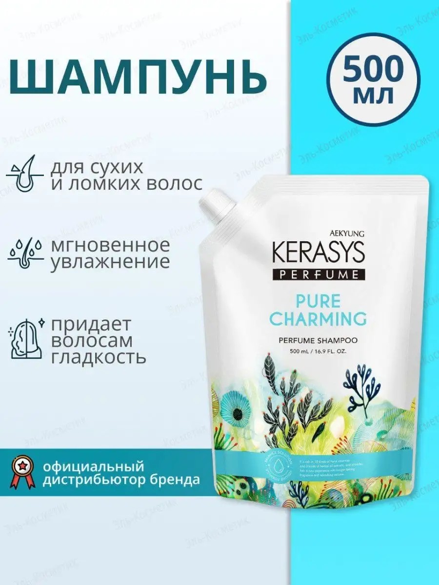 PURE CHARMING Perfumed Shampoo for Dry and Brittle Hair, Professional Care, for All Hair Types, 500 ml (refill). This Korean shampoo deeply moisturizes and restores hair structure along the entire length, preventing breakage and strengthening the ends. Panthenol actively nourishes and strengthens hair follicles, giving hair smoothness and luxurious volume, preventing dandruff and itching. Basil extract moisturizes the hair and scalp, leaving hair elastic and silky. Natural chamomile extract prevents hair loss and breakage and stimulates hair growth. This professional shampoo makes combing and styling easier. Perfumed ampoules impart a delicate floral-citrus scent, leaving a light trail. This Korean shampoo has been dermatologically tested. It is suitable for split ends, damaged, bleached, and color-treated hair. For greater effect, use with Kerasys conditioners and Korean hair cosmetics.