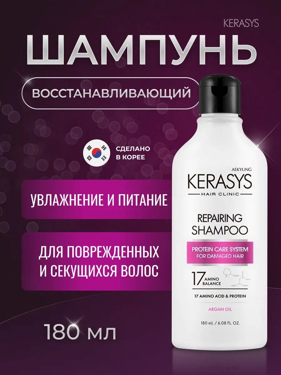 KeraSys – представляет уникальную линейку профессиональных ухаживающих средств для кожи головы и волос. Шампунь "Восстанавливающий" разработан для сухих, ослабленных и пережжённых волос. Этот профессиональный продукт из Кореи разработан специально для женщин, которые ценят качественный уход за своими волосами. Специальная формула мгновенно восстанавливает структуру волос по всей длине, уменьшая сечение и ломкость. Волосы обретают жизненную силу, эластичность и блеск. Шампунь обогащен лечебными веществами в составе липосом, которые проникают в клеточные структуры волоса и оказывают восстанавливающее и лечебное действие. Кератиновый комплекс заполняет поврежденные участки, трещинки и пустоты в структуре волоса, склеить посеченные кончики, укрепить волосы, придав им дополнительную прочность. Кератин подходит для восстановления волос любого типа. Аргановое масло повышает эластичность и восстанавливает нормальный уровень увлажнённости, делает волосы мягкими и шелковистыми, укрепляет структуру и снимает электризуемость. Шампунь придает ухоженный и здоровый вид волосам. Он также восполняет недостаток собственного белка в структуре волос, делая их более крепкими и здоровыми. Это особенно важно для поврежденных вследствие частого химического, теплового и солнечного воздействия волос. Шампунь также подходит для окрашенных, светлых, обесцвеченных и кудрявых волос. Дорожный шампунь - отличный подарочный вариант для женщины или мужчины любого возраста: от подростка до взрослого человека на 8 марта, 14 февраля, 23 февраля, День рождения, Новый год и др праздники для любимой девушки или парня, мамы или папы, бабушки или дедушки, сестры или брата, подруги или друга. Очаруйте всех своими шикарными локонами, благодаря уникальному косметическому средству от корейских производителей.