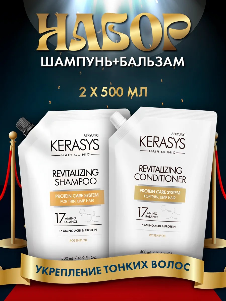 Introducing Kerasys – a revitalizing hair care set containing a 500 ml shampoo and conditioner (2 refills) in a soft packaging. This set contains the power of 17 amino acids and proteins, providing effective professional hair care at home. Your hair will become healthy, shiny, and well-groomed. This cosmetic hair care set boasts unique properties and a formula specially developed for maximum results. The revitalizing shampoo with keratin in the set gently cleanses hair of impurities without drying it out. The conditioner intensively nourishes hair, giving it softness, vibrant shine, and elasticity. Using the revitalizing shampoo and conditioner together, you can easily achieve healthy, vibrant hair.