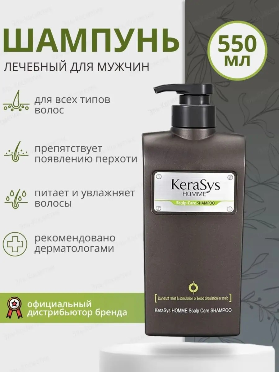 Homme Scalp Care Men's Hair Shampoo. Scalp treatment for professional care for all types of men's hair. The active ingredients of this men's shampoo deeply cleanse the hair and scalp, regulate sebum production, and prevent dandruff, itching, and flaking. Mineral-rich ocean waters moisturize and nourish the hair, improve circulation, and stimulate scalp cell regeneration, strengthening its barrier function. Organic thyme extract has antibacterial and anti-inflammatory properties, strengthens hair follicles, prevents hair loss, and stimulates hair growth. This men's shampoo creates an excellent base for styling, makes hair manageable, and adds natural shine. This Korean shampoo has been dermatologically tested. It is suitable for split ends, damaged, bleached, and color-treated hair. For greater effect, use with Kerasys conditioners and Korean hair cosmetics.