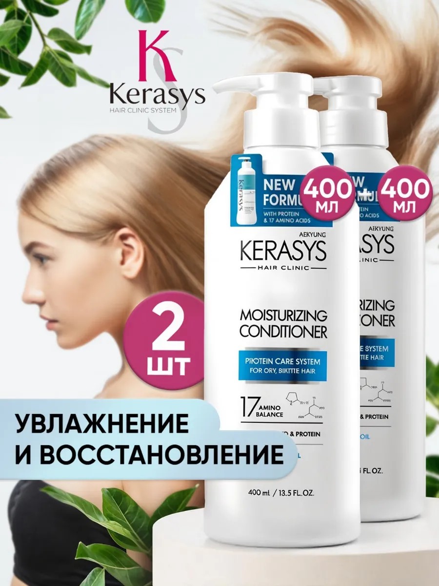 Korean hair cosmetics - Kerasys Moisturizing 2-in-1 hair conditioner is an effective moisturizer without silicones, parabens, and dyes. It is specially formulated to provide professional care for damaged, brittle, and dry hair. Available in a convenient 600 ml plastic bottle with a dispenser or TWO 400 ml bottles in a set. KERASYS Korean hair conditioner deeply moisturizes and restores hair structure along its entire length. This balm maintains softness and a well-groomed appearance, while also effectively addressing breakage and split ends. This Korean product is enriched with extracts of arnica montana, yellow gentian, and leontopodium alpinum, which instantly ensure easy combing and provide a comprehensive restorative effect. Hair appears more well-groomed and shiny. Suitable for both children and adults, for both men and women. It also prevents color fading from porous and damaged hair. KERASIS conditions, moisturizes, and restores elasticity and softness. KERASIS conditioner gives hair additional smoothness, restoring natural shine and strength. It also facilitates combing. Directions: Apply to damp, shampooed hair; distribute over the entire length; leave on for 1-3 minutes and rinse with water. Active therapeutic ingredients penetrate the cellular structure of the hair to restore hair health and care for the ends. Hair regains vitality, natural shine, and silkiness. Natural jojoba and avocado oils strengthen, nourish, and moisturize the hair and scalp, stimulating hair restoration and growth. Regular use of this moisturizing conditioner is beneficial for hair growth, as it protects hair from the negative effects of the environment, styling products, and hair dryers, making combing easier. This product is designed to add volume to the roots and helps reduce excessive frizz. Korean hair balm has been dermatologically tested.