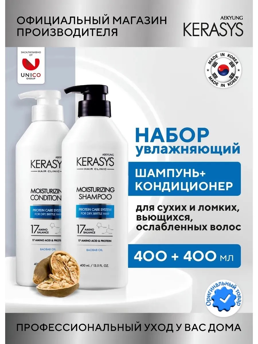 Набор профессиональный шампунь и кондиционер бальзам Kerasys HAIR CLINIC УВЛАЖНЯЮЩИЙ это шампунь и кондиционер мужской и шампунь и кондиционер женский для сухих волос, для ломких волос, вьющихся волос и волос с секущимися концами. Корейский шампунь и кондиционер для волос имеет клинически подтвержденную эффективность. В результе исследований доказано, что шампунь и кондиционер для волос Kerasys обеспечивает на 36% больше увлажнения волос. Шампунь и кондиционер Керасис делает волосы в 3 раза более гладкими. Увлажняющий шампунь и кондиционер для волос с протеиновой формулой мгновенно восстанавливает структуру волос и уплотняет волосы по всей длине, от корней до кончиков.Kerasys шампунь и кондиционер увлажняющий для волос с липосомами, обогащенными лечебными веществами, глубоко проникает в клеточные структуры волоса, оказывает восстанавливающее и увлажняющее действие. Керасис шампунь и кондиционер для волос с пантенолом (провитамин В5) и маслом плодов баобаба, питает и наполняет волосы жизненной силой, придает блеск и шелковистость. Шампунь и кондиционер профессиональный восполняет недостаток собственного белка в структуре волос, делает их более крепкими и здоровыми. Чтобы ваши волосы выглядели здоровыми, блестящими и шелковистыми, используйте увлажняющий шампунь и кондиционер для волос Kerasys. Шампунь и кондиционер для волос женский профессиональный для домашнего ухода с эффектом как после салона. Пробуйте шампунь и кондиционер Kerasys женский уже сегодня и ваши волосы будут лучше с каждым днем. Выберите шампунь и кондиционер для сухих волос женский, чтобы ваши волосы всегда выглядели ухоженными, здоровыми и сияющими. Шампунь и кондиционер мужской увлажняющий полезен для волос, склонных к сухости, ломкости, вьющимся, и для тех, у кого волосы склонны к накоплению статического электричества и сечению. Kerasys шампунь и кондиционер мужской это корейские разработки специально для сухих и ломких волос, без парабенов. Шампунь и кондиционер для сухих волос может использоваться ежедневно для достижения наилучших результатов. Увлажняющий шампунь и кондиционер подойдет для всех типов волос.Шампунь и кондиционер Корея эффективен для всей семьи. Ваши волосы будут благодарны вам за Шампунь и кондиционер Увлажняющий Корея! Подходит для сухих на концах прямых и всех видов волос: пористых, кудрявых, вьющихся, волнистых.