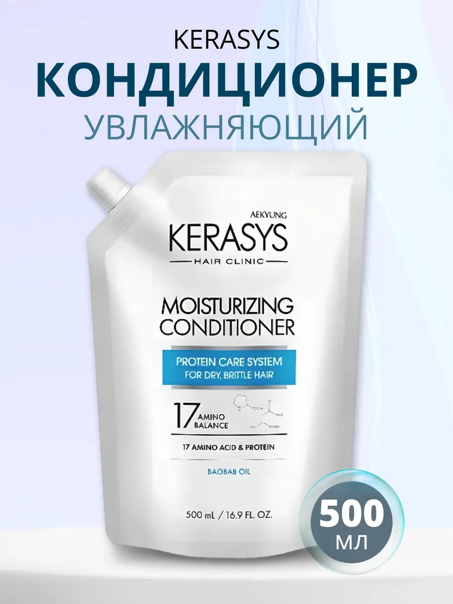 Кондиционер для волос Kerasys Увлажнение в мягкой упаковке (запаска) 500 мл разработан по специальной формуле, обеспечивающей профессиональный уход для поврежденных, ломких и сухих волос. Корейский кондиционер керасис для волос глубоко увлажняет волосы и восстанавливает их структуру по всей длине. Активные лечебные компоненты проникают в клеточную структуру волоса для восстановления здоровья волос. Волосы обретают жизненную силу, естественный блеск и шелковистость. Натуральные масла жожоба и авокадо укрепляют, питают и увлажняют волосы и кожу головы, стимулируя восстановление и рост волос. Регулярное использование увлажняющего кондиционера для волос защищает волосы от негативного воздействия внешней среды, средств для укладки и фена, облегчает расчесывание. Корейский бальзам для волос прошел дерматологические испытания. Средство подходит для секущихся, поврежденных вследствие частой окраски и обесцвечивания волос. Бальзам для волос . Кондиционер для волос для женщин . Корейский уход за волосами .Для большего эффекта используйте с шампунями и корейской косметикой для волос Kerasys.