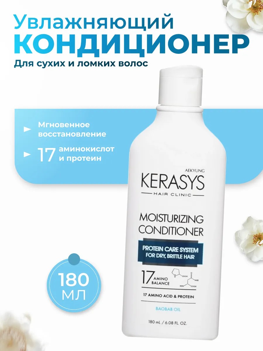 Увлажняющий протеиновый кондиционер Kerasys с липосомами, обогащенными лечебными веществами, проникает в клеточные структуры волоса, оказывая восстанавливающее и лечебное действие.\nСодержит пантенол (провитамин В5) и масло плодов баобаба, он позволяет волосам обрести жизненную силу, блеск и шелковистость, кондиционер питает и разглаживает каждый волос, делая его гладким и блестящим!