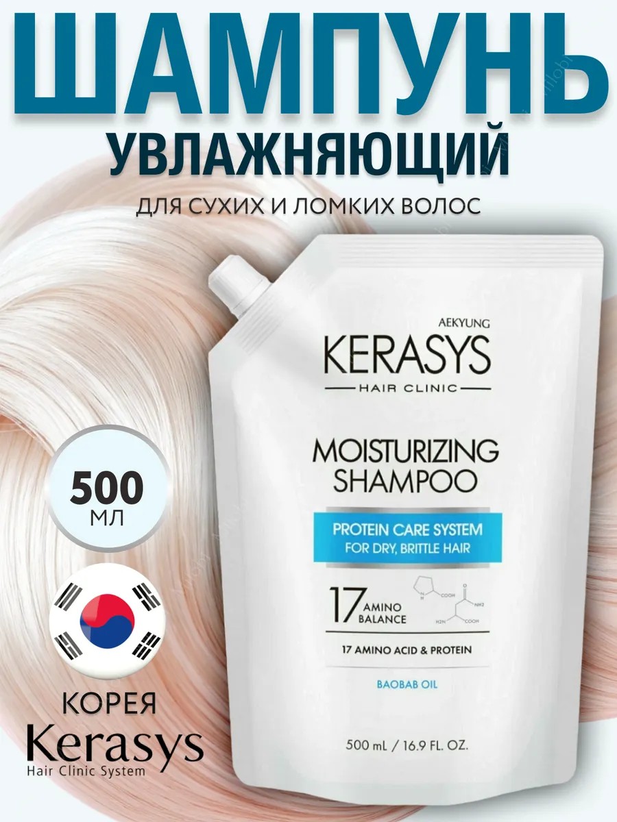 Kerasys Professional Moisturizing Shampoo Doy-Pack 500 ml is a Korean solution for intensive restoration of dry, brittle, and frizzy hair. The formula with 17 amino acids, baobab seed oil, and panthenol instantly replenishes protein deficiency in the hair structure, restoring vitality even after sun exposure, salt water, or a chlorinated pool. Clinically proven: 36% more hydration than similar products, and hair becomes 3.4 times smoother from the first use. Key benefits: Deep restoration. The amino acid complex (hydrolyzed wheat, soy, and rice proteins) penetrates keratin voids, repairing damage from the inside. Hair regains density, natural shine, and resistance to split ends. Liposome technology. Microparticles identical to human cell membranes deliver active ingredients deep into the hair shaft. The absorption of nutrients is up to 90% (versus 30% in conventional shampoos), providing a long-lasting effect.\n\nInstant hydration\nBaobab oil and panthenol create a protective barrier, blocking moisture loss. Silkiness is noticeable after the first wash, and frizz is reduced by 54% when used with Kerasys conditioner.\n\nSafe care\nFree of parabens and aggressive surfactants. Suitable for daily use by men, women, and teenagers. The light powdery-floral unisex scent does not irritate sensitive skin.\n\nWho is it for:\nNatural, curly, or colored hair with dryness, static electricity, damaged after heat styling, perms, UV radiation, requiring lightness without weighing down or complex care.\n\nDirections for use: Apply to wet hair, lather, rinse with water. For a more intense effect, use with the Kerasis line conditioner.
