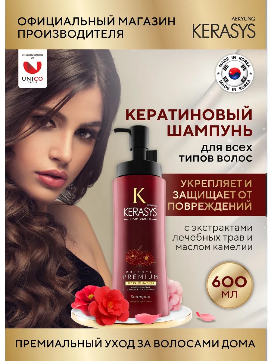 Kerasys Oriental Premium корейский шампунь для сияния волос основан на специальной формуле подходит для всех типов волос. Содержит масло камелии, которое укрепляет ломкие волосы, делая их шелковистыми по всей длине. Кератиновый комплекс питает и разглаживает поврежденные волосы, восстанавливая их красоту. также содержит композицию из традиционных восточных трав: женьшень, жгун-корень, орхидея, ангелика, гранат и листья камелии. Композиция укрепляет луковицы волос и предотвращает выпадение. Шампунь питает, восстанавливает, витаминизирует, увлажняет, тонизирует, защищает от бактерий и грибков, заживляет, способствует росту и предотвращает выпадение, защищает их от ультрафиолета. В результате волосы станут упругими, плотными и полными жизни, блеска и эластичности.