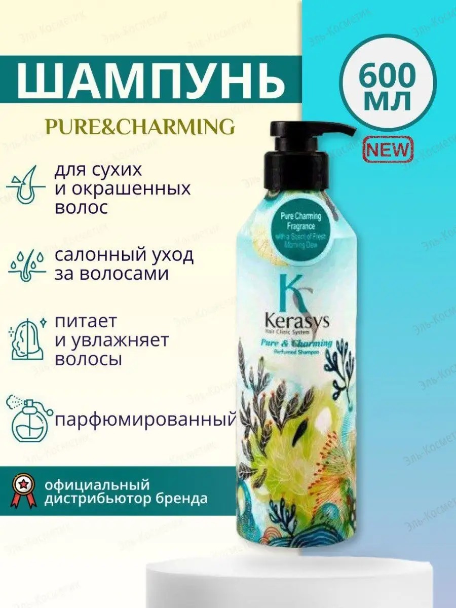 Perfumed Line Hair Shampoo Pure & Charming 600 ml. Perfumed shampoo for hair kerasys. Hair shampoo kerasys. Specially developed formula for dry and brittle hair. Instantly moisturizes and restores hair structure along the entire length. Hair gains vitality, shine and silkiness. Kerasys shampoo for hair Contains panthenol (provitamin B5), extracts of white lily and gardenia. Aroma: a clean and fresh aroma like the coolness of an early spring morning. Will give you incredible charm and unique appeal. Perfume composition: Top note: bergamot, mandarin, green mandarin. Middle note: lily of the valley, peach blossom, pink rose. Base note: cedar, musk, cardamom. Hair shampoo for women and men.