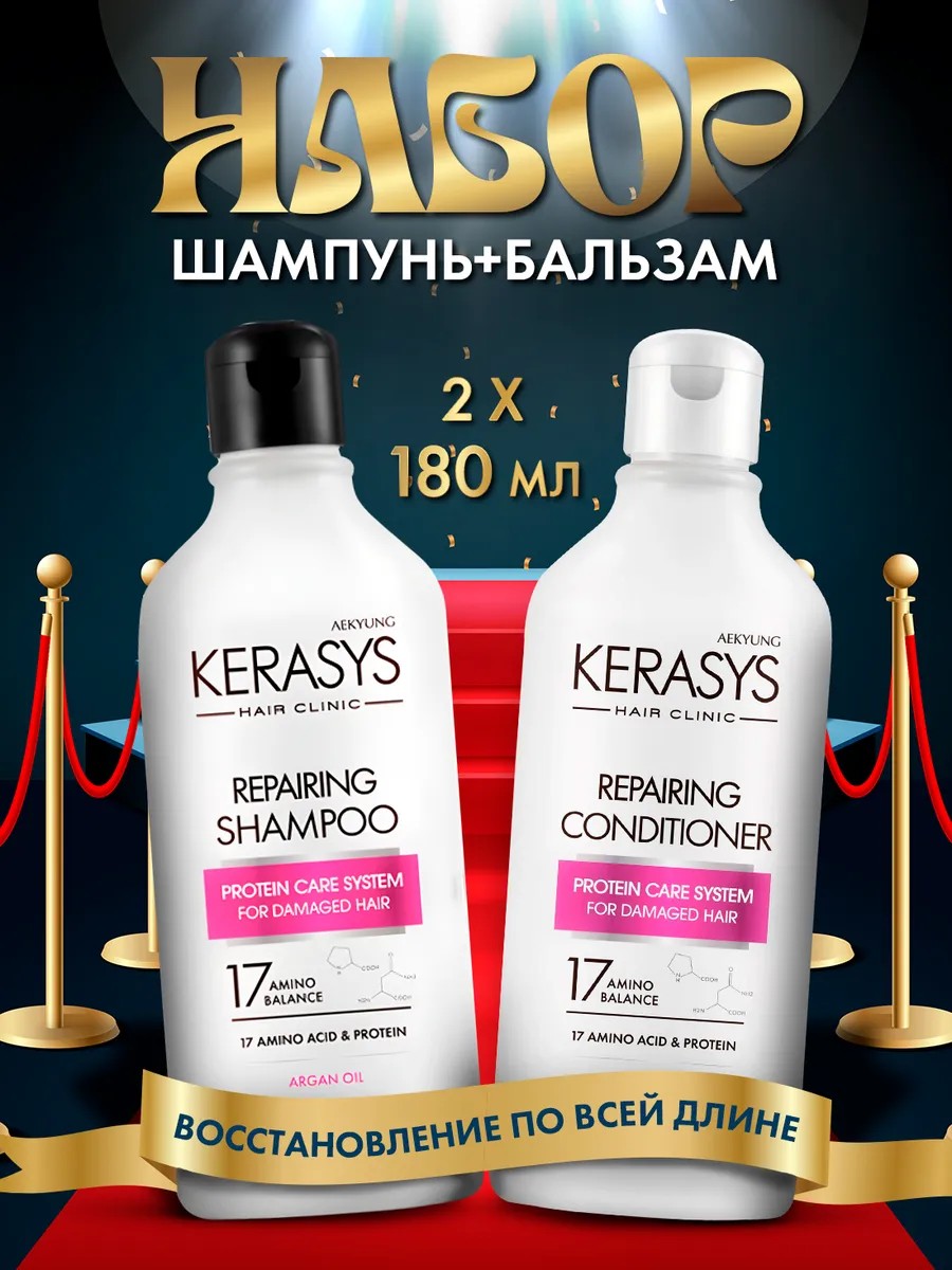 Представляем вам Kerasys - восстанавливающий набор ухода за волосами, который содержит шампунь и бальзам в удобном объеме 180 мл (х2). Данный набор содержит в себе силу 17 видов аминокислот и протеинов, которые обеспечивают эффективный профессиональный уход за волосами в домашних условиях. Ваши волосы станут здоровыми, сияющими и ухоженными. Косметический набор ухода за волосами отличается своими уникальными свойствами и формулой, разработанной специально для поврежденных волос с секущимися концами. Профессиональный женский шампунь с кератином в наборе бережно очищает волосы от загрязнений, при этом не пересушивая их. Бальзам интенсивно увлажняет и питает волосы, восстанавливает структуру волос по всей длине. Используя восстанавливающий шампунь в комплекте с бальзамом, вы легко достигнете результат здоровых живых волос. Наш набор отлично подойдет для сухих волос с секущимися кончиками, а также для вьющихся. Основой средств для волос входят активные компоненты полезного масла арганы в комплексе с протеинами. Масла глубоко проникают в структуру волос, эффективно питает их изнутри и интенсивно восстанавливает поврежденные волосы, придавая им сияние и мягкость. Протеины придают волосам эластичность и укрепляют их, делая их более устойчивыми к негативным воздействиям окружающей среды. Отлично подойдет для волос после окрашивания или частого использования фена и плоек. Помимо этого, хочется отметить нежный приятный аромат шампуня и кондиционера для волос, которые придадут вам ощущение релакса во время принятия душа. Корейский бренд Kerasys - это профессиональный уход за волосами в домашних условиях.