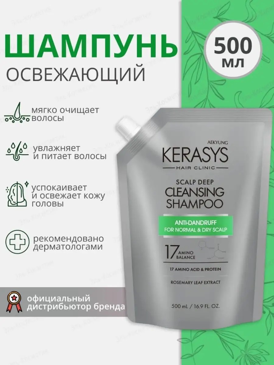 Шампунь для волос Kerasys Освежающий в мягкой упаковке (запаска) 500 мл разработан по специальной формуле для СУХОЙ и НОРМАЛЬНОЙ кожи головы, склонной к появлению перхоти и зуда. Мягко очищает, не вызывая раздражения, Содержит 17 видов аминокислот и протеинов которые эффективно питают волосы изнутри , и масло розмарина, которое эффективно успокаивает и освежает раздраженную и чувствительную кожу головы. Шампунь для волос для женщин и для мужчин обеспечивает максимальный уход за волосами . Шампунь для волос от перхоти . Шампунь для волос керасис . Максимально бережное лечение ваших волос корейским шампунем kerasys.