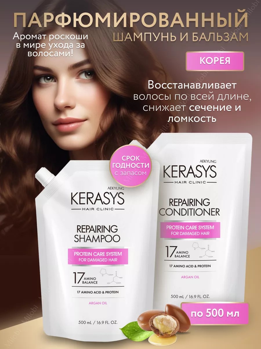 Introducing the Kerasys Repairing Shampoo perfumed set: shampoo (500 ml) and conditioner (500 ml) for fine, thin hair. This professional set from the renowned Korean brand is designed to improve hair health and make it easy to comb. The set includes 500 ml of shampoo and the same amount of moisturizing conditioner with a natural formula based on keratin, rosehip extract, and oils. The shampoo and conditioner in the set are ideal for damaged, color-treated, bleached, and highlighted hair. Thanks to their vitamin-rich formula, hair is quickly restored, gaining additional volume. The sulfate-free formulas gently cleanse hair without drying it out. This cosmetic set is designed for both women and men and makes a great gift for loved ones or coworkers for any holiday (New Year, September 1st, March 8th, or birthday). This dermatologically tested product is suitable even for sensitive scalps, and its perfumed aroma leaves your locks smelling fresh and sweet all day long. Rosehip extract stimulates hair growth and helps combat split ends. This treatment is also beneficial for curly hair—it makes light blonde or brunette curls easier to style without weighing them down. Kerasis' keratin formula strengthens hair from root to tip, making curls stronger and more elastic. This Korean brand's formula provides nourishment thanks to the valuable herbs and oils in its formula. Conveniently packaged in a soft doy-pack, this product is easy to store and use. This treatment will help you enjoy healthy, shiny locks every day! The complete care effect of this innovative development will bring beauty into your life without compromising the health of your hair.