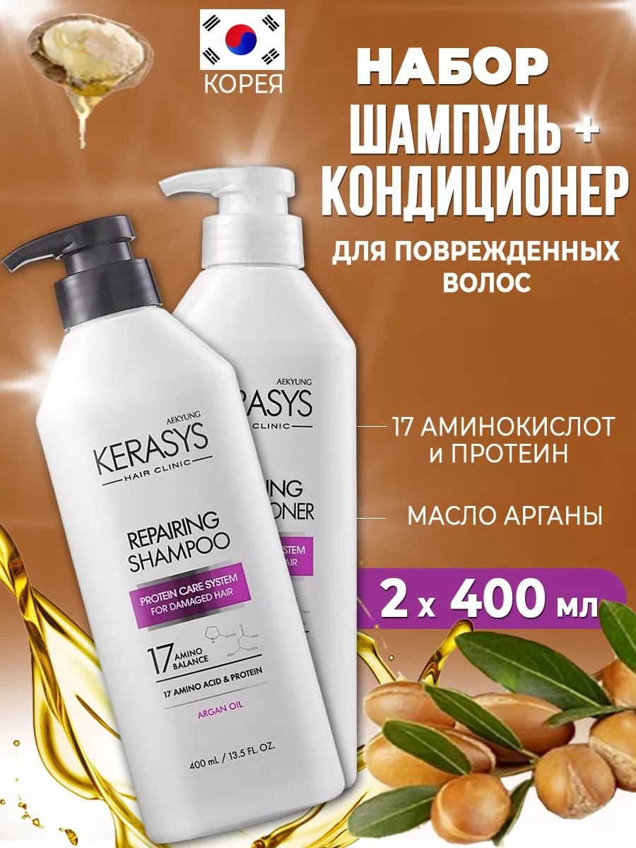 Набор / Шампунь для волос Восстанавливающий 400 мл + Кондиционер 400 мл / для поврежденных волос.Специально разработанная формула для сухих и ломких волос, мгновенно увлажняет и восстанавливает структуру волос по всей длине. Волосы обретают жизненную силу, блеск и шелковистость. Обогащен лечебными веществами в составе липосом, которые проникают в клеточные структуры волоса и оказывают восстанавливающее и лечебное действие. Содержит пантенол (провитамин В5). Эффективность применения доказана клинически.На 36 % больше увлажнения. В 3.4 раза более гладкая текстура волос. Восполняет недостаток собственного белка в структуре волос.Kerasys это линия средств профессионального уровня для ухода за различными типами волос в домашних условиях.Тип волос : сухие , ломкие , вьющиеся, волосы склонные к накоплению статического электричества, ломкости и сечению.