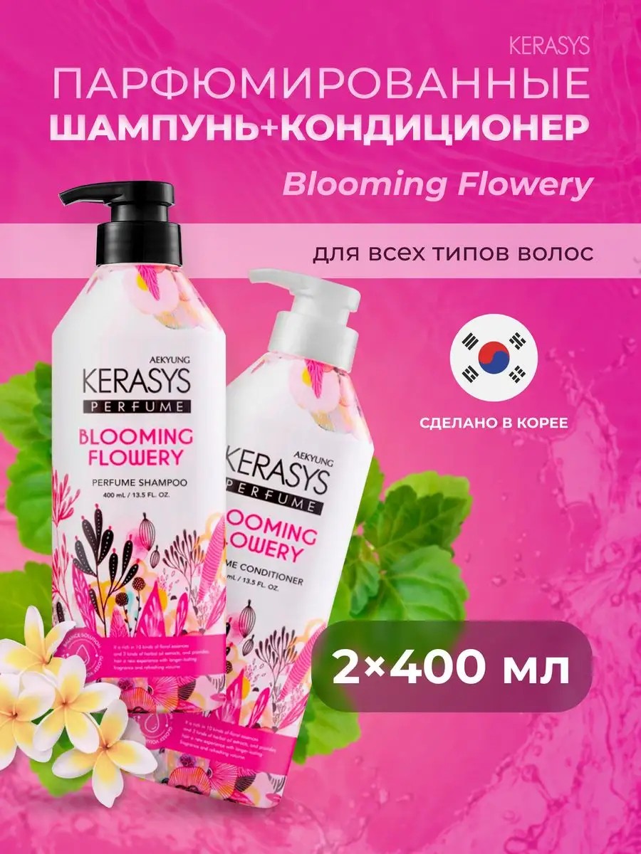 KeraSys presents a unique line of professional scalp and hair care products. The perfumed women's shampoo and conditioner, "Fleur," are specially formulated for all hair types. After washing with the shampoo and conditioner, hair becomes not only silky, flowing, and shiny, but also fragrant. It's all down to the perfumed formula of these products. This Korean women's shampoo and conditioner are enriched with highly effective active ingredients that keep hair silky and soft. Key active ingredients: Panthenol moisturizes, heals wounds and cracks, and smoothes. Rose water, included in the product, intensively moisturizes dry scalp, seals split ends, and adds shine and smoothness to locks. White lily extract soothes and relieves irritation, preventing tangling, color loss, and premature aging of hair follicles. Many shampoos and conditioners have a pleasant scent, but with Fleur, the effect lasts for several hours. The aroma is floral and citrusy, with fresh notes of mandarin and pomelo, enhanced by base notes of cedar and patchouli. An ideal composition for romantic, gentle, and sensual souls. Exclusive Kerasys fragrances will highlight your individuality. Daily use of the Kerasys set will not only improve the condition of your hair but also help strengthen its roots. This women's shampoo and conditioner set is an excellent gift option for women of any age: from teenagers to adults, for March 8th, February 14th, birthdays, New Years, and other holidays—for a girlfriend, mother, grandmother, sister, or friend.