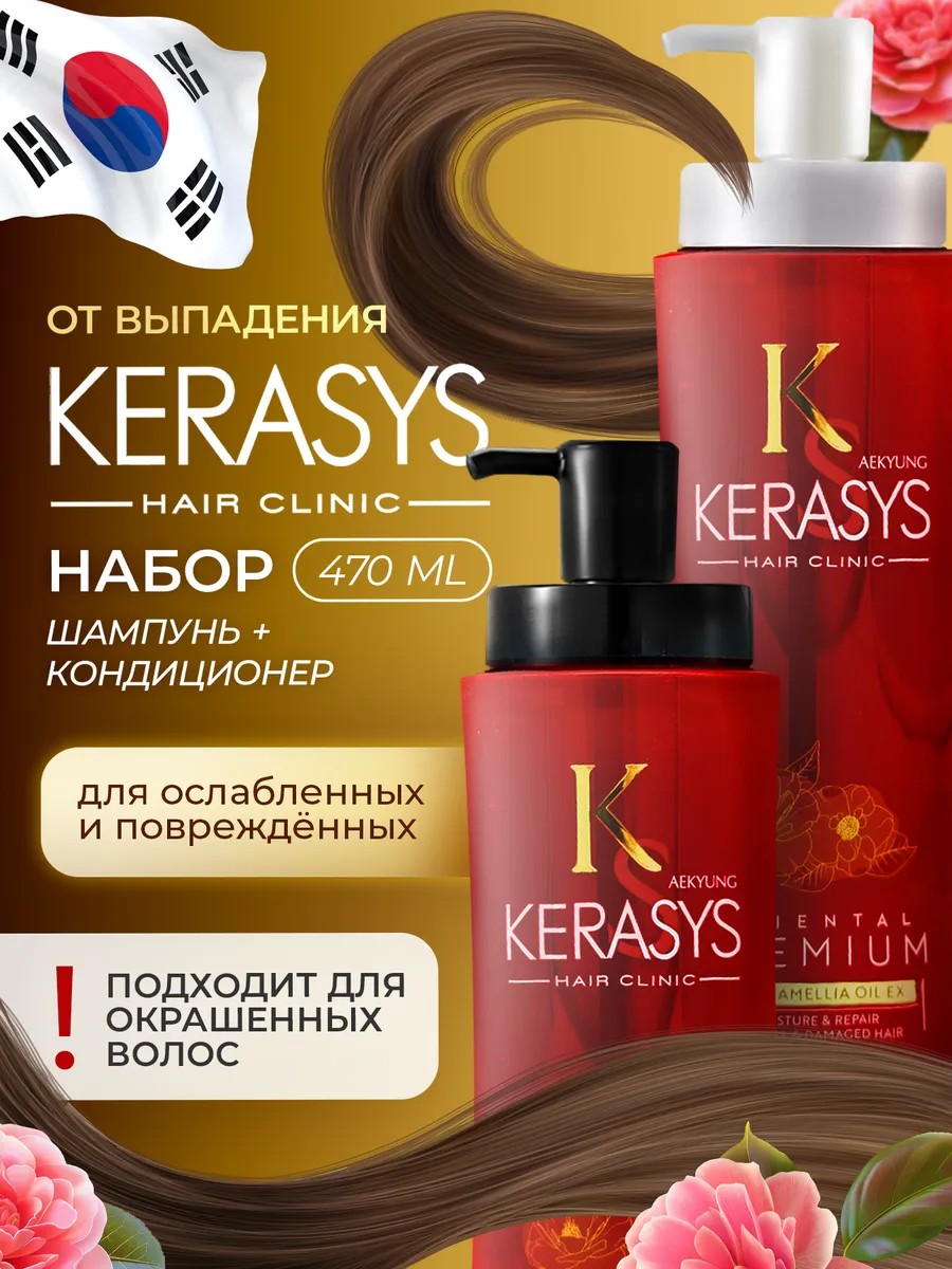 The Kerasys Oriental Premium set combines shampoo and conditioner, designed for comprehensive care of hair in need of nourishment and strengthening.