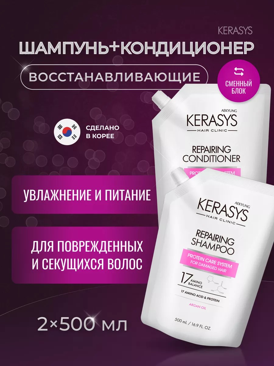 KeraSys – представляет уникальную линейку профессиональных ухаживающих средств для кожи головы и волос. Шампунь и кондиционер "Восстанавливающий" разработаны для сухих, ослабленных и пережжённых волос. Этот профессиональный продукт из Кореи разработан специально для женщин, которые ценят качественный уход за своими волосами. Специальная формула мгновенно восстанавливает структуру волос по всей длине, уменьшая сечение и ломкость. Волосы обретают жизненную силу, эластичность и блеск. Шампунь и кондиционер обогащены лечебными веществами в составе липосом, которые проникают в клеточные структуры волоса и оказывают восстанавливающее и лечебное действие. Кератиновый комплекс заполняет поврежденные участки, трещинки и пустоты в структуре волоса, склеить посеченные кончики, укрепить волосы, придав им дополнительную прочность. Кератин подходит для восстановления волос любого типа. Аргановое масло повышает эластичность и восстанавливает нормальный уровень увлажнённости, делает волосы мягкими и шелковистыми, укрепляет структуру и снимает электризуемость. Шампунь и бальзам придают ухоженный и здоровый вид волосам. Они также восполняют недостаток собственного белка в структуре волос, делая их более крепкими и здоровыми. Это особенно важно для поврежденных вследствие частого химического, теплового и солнечного воздействия волос. Набор также подходит для окрашенных, светлых, обесцвеченных и кудрявых волос. Набор шампунь и бальзам - отличный подарочный вариант для женщины или мужчины любого возраста: от подростка до взрослого человека на 8 марта, 14 февраля, 23 февраля, День рождения, Новый год и др праздники для любимой девушки или парня, мамы или папы, бабушки или дедушки, сестры или брата, подруги или друга. Очаруйте всех своими шикарными локонами, благодаря уникальному косметическому средству от корейских производителей.