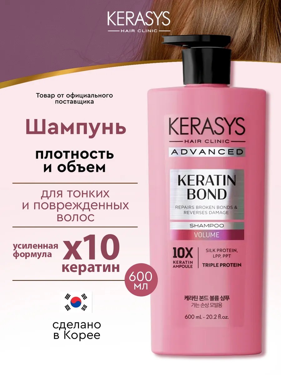 Корейский шампунь для тонких, ослабленных волос KeraSys Advanced Keratin Bond Объем, 600 мл - профессиональный уход с эффектом восстановления и увеличения плотности волос. Идеально подходит для ухода за поврежденными волосами, склонными к ломкости и истончению.