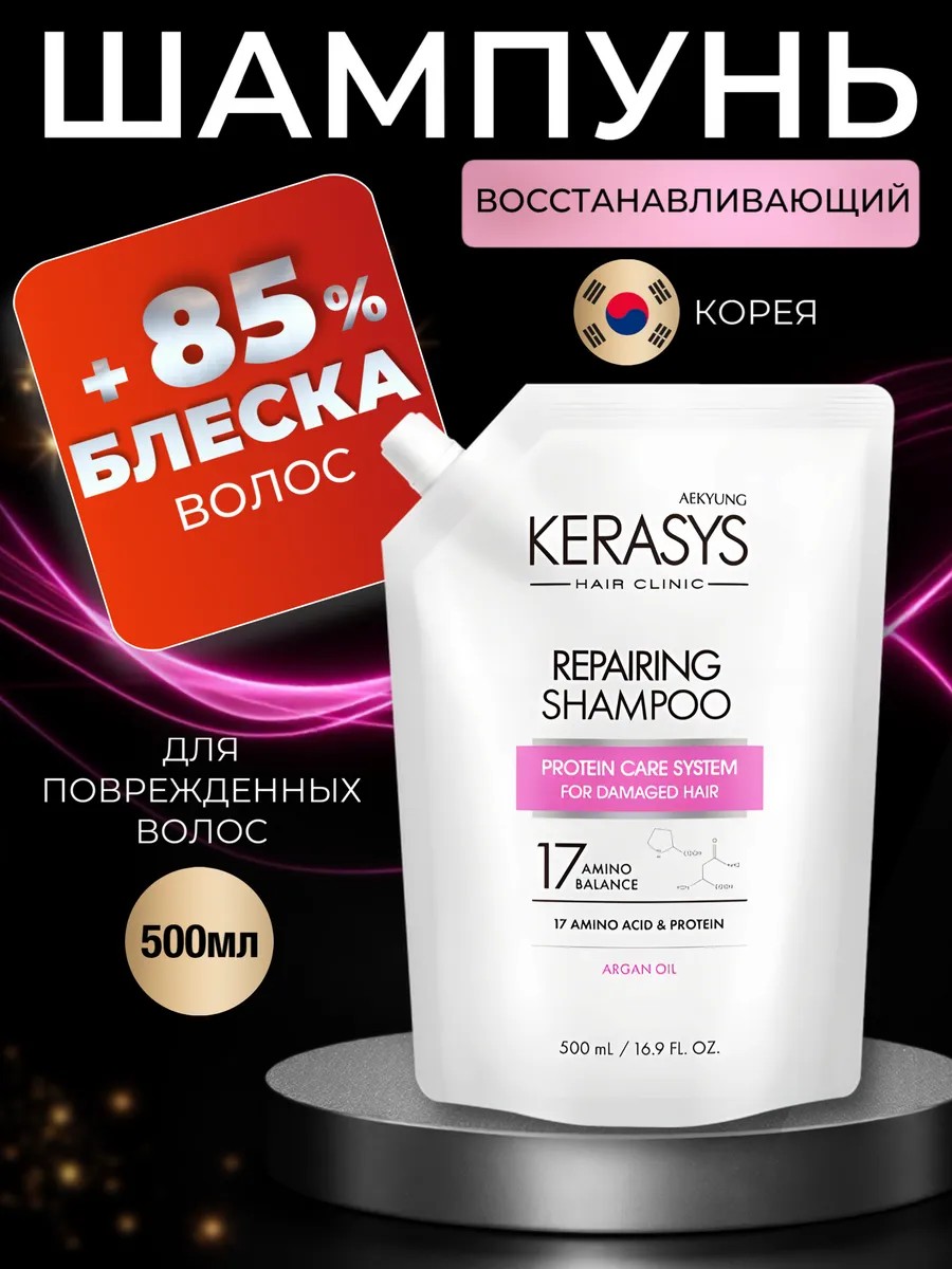 Профессиональный шампунь Kerasys Восстанавливающий (дой-пак 500 мл) — интенсивная терапия для поврежденных окрашиванием, термоукладкой и УФ-излучением волос. Формула с 17 аминокислотами, аргановым маслом и растительными протеинами восполняет дефицит кератина, устраняя ломкость, сечение и пушистость. Клинически доказано: +58% защиты от солнца, блеск усилен в 2.2 раза, эластичность на 43% выше после 4 недель использования 715.