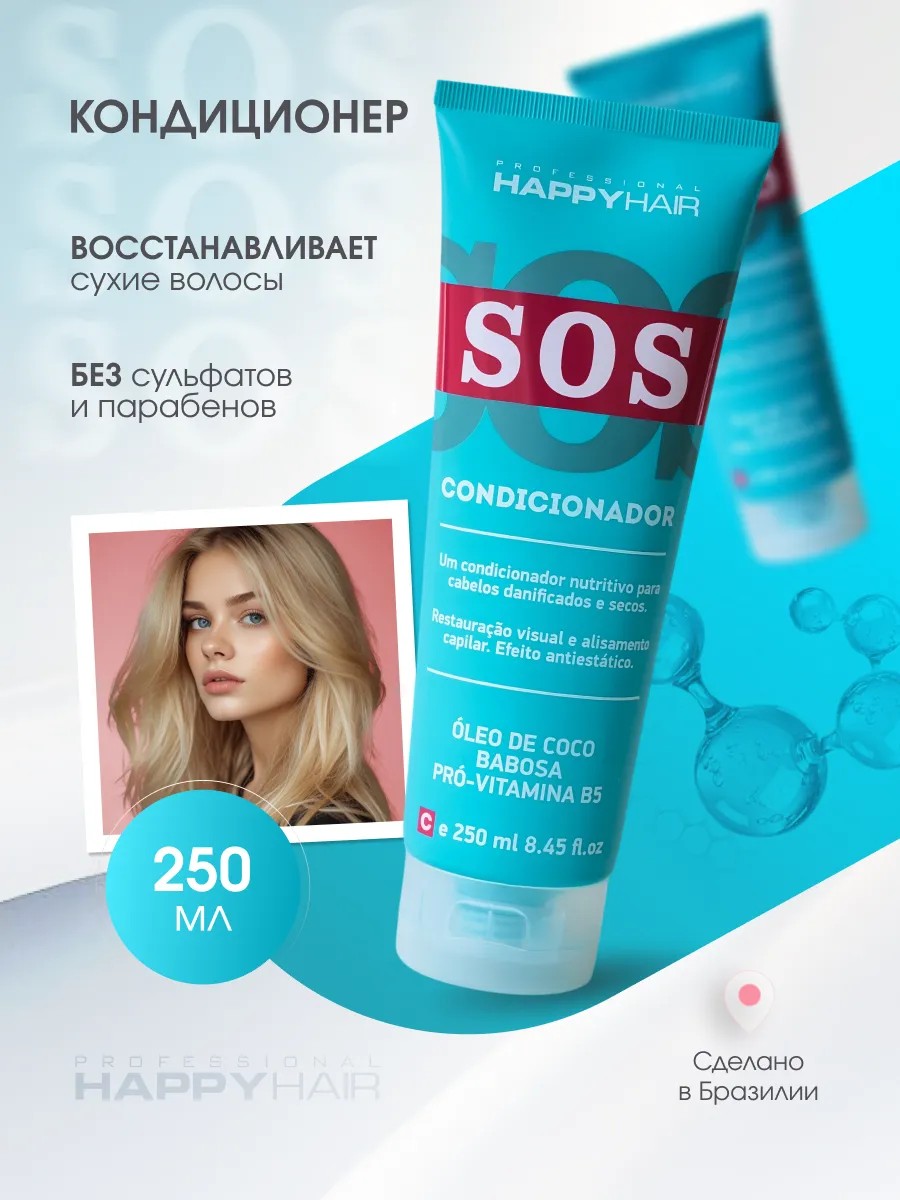 Профессиональный кондиционер Happy Hair SOS. Бессульфатный бальзам Первый после процедурный с эффектом ботокса. Высокое содержание пантенола и биотина в составе оптимизирует метаболические процессы в клетках кожи, стимулируя рост волос. Витамин А (ретинол) или витамин молодости, оказывают укрепляющее свойство и обеспечивает волосы здоровым блеском. Мягкие овсяные аминокислоты (oat amino acids) удерживают влагу и дисциплинируют волосы. Идеален для сухих и нормальных волос. Для лучшего эффекта необходимо использовать весь комплект. Нормализует работу волосяных фолликул, восстанавливает естественную первозданную гладкость, уменьшает ломкость и облегчает расчесывание, облагораживая сияющим блеском. Безсульфатный ополаскиватель косметический женский позволяет достичь эффекта профессиональных салонных процедур в домашних условиях, придает волосам здоровый вид и не утяжеляет их. Этот бальзам идеально подходит для тех, кто хочет, чтобы их волосы выглядели потрясающе без необходимости тратить кучу денег на дорогие средства и основные салонные процедуры. Уходовая косметика пленка с особым составом восстанавливает структуру локонов, дарит здоровый блеск и красоту, делая их гладкими как шелк, доя роста волос. Обеспечивает бережную очистку волос. Идеальный подарок на 8 марта!