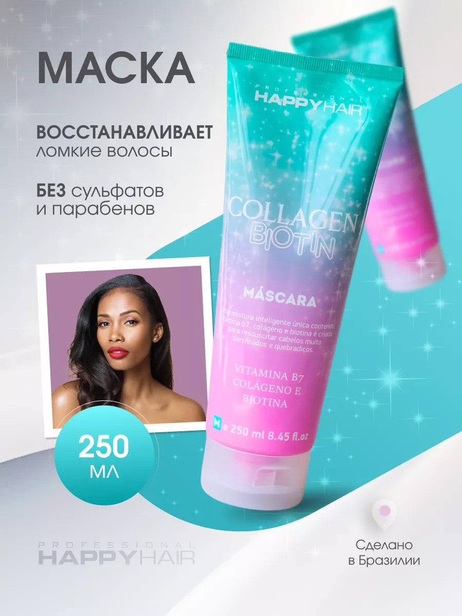 Профессиональная маска happy hair collagen biotin , ( коллаген и биотин ) Бессульфатная маска содержит витамин B7, коллаген и биотин, они созданы для восстановления сильно поврежденных, ломких, естественных или окрашенных волос. Не содержит сульфатов SLS, SLES и парабенов. Для нормальной и склонной к жирности кожи головы. Mask филер идеально для ухода после процедуры кератинового выпрямления, нанопластики, ламинирования, химических процедур, кератин и ботокса. Нормализует работу волосяных фолликул, восстанавливает естественную первозданную гладкость, уменьшает ломкость и облегчает расчесывание, облагораживая сияющим блеском. Безсульфатная маска косметическая для волос женская, мужская или подростков позволяет достичь эффекта профессиональных салонных процедур в домашних условиях, придает волосам здоровый вид и не утяжеляет их. Эта маска идеально подходит для тех, кто хочет, чтобы их волосы выглядели потрясающе без необходимости тратить кучу денег на дорогие средства и основные салонные процедуры. Уходовая косметика пленка с особым составом восстанавливает структуру локонов, дарит здоровый блеск и красоту, делая их гладкими как шелк, доя роста волос. Силиконовая маска обеспечивает бережную очистку волос, против выпадения для мужчин и женщин. Бразильская маска более эффективная чем Корейская. Производитель косметики для салонов красоты создал sos средство для домашнего ухода, которые подходят для всех типов волос. Технологи постоянно обновляют и улучшают продукцию для ухода за волосами, используют лучшие ингредиенты. Биотин - способствуют укреплению и росту волос, понижают активность сальных желез. Коллаген - препятствует появлению ломкости и выпадению волос. В нашем магазине "KERATIN BUTIK" ВЫ найдете любое средства и подарочные наборы Happy Hair Идеальный подарок на 8 марта маме, подруге, сестре